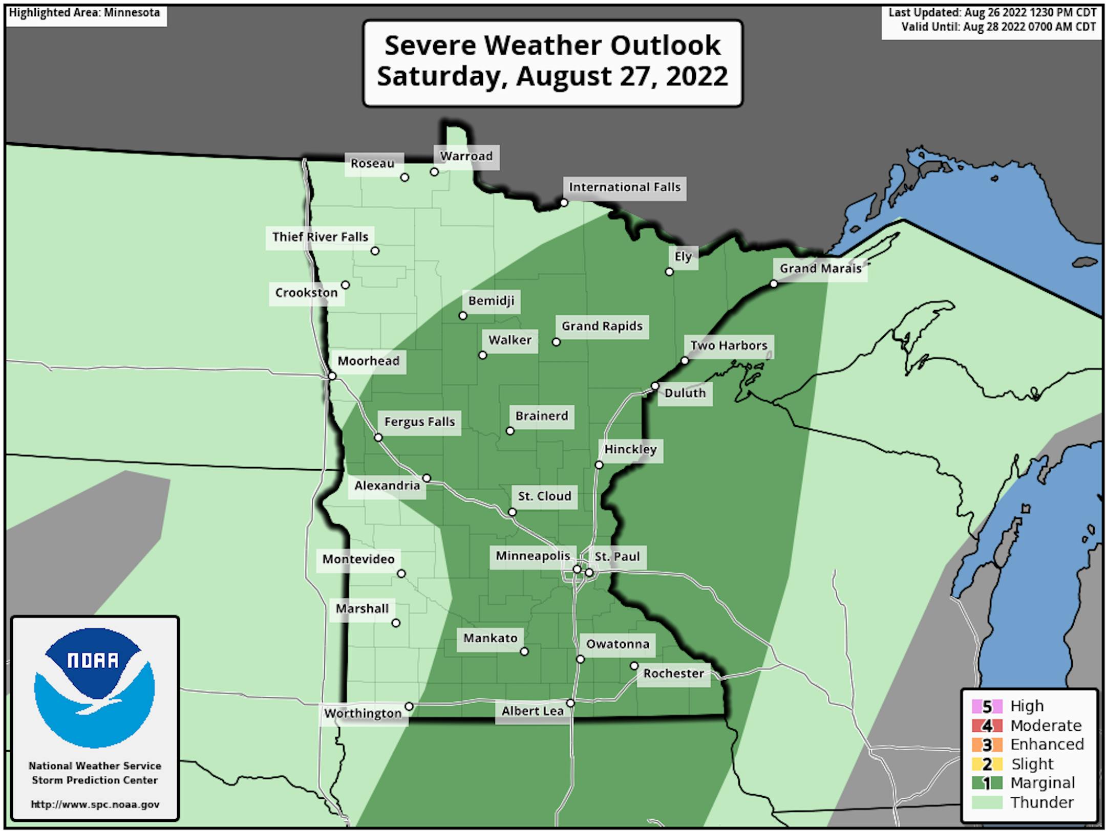 According to NOAA's SPC, there is a risk of isolated strong to severe storms across parts of the region today. Isolated strong wind and hail events will be the primary threat with any of the stronger storms, but there could be a brief spin up tornado across the northern half of Minnesota.