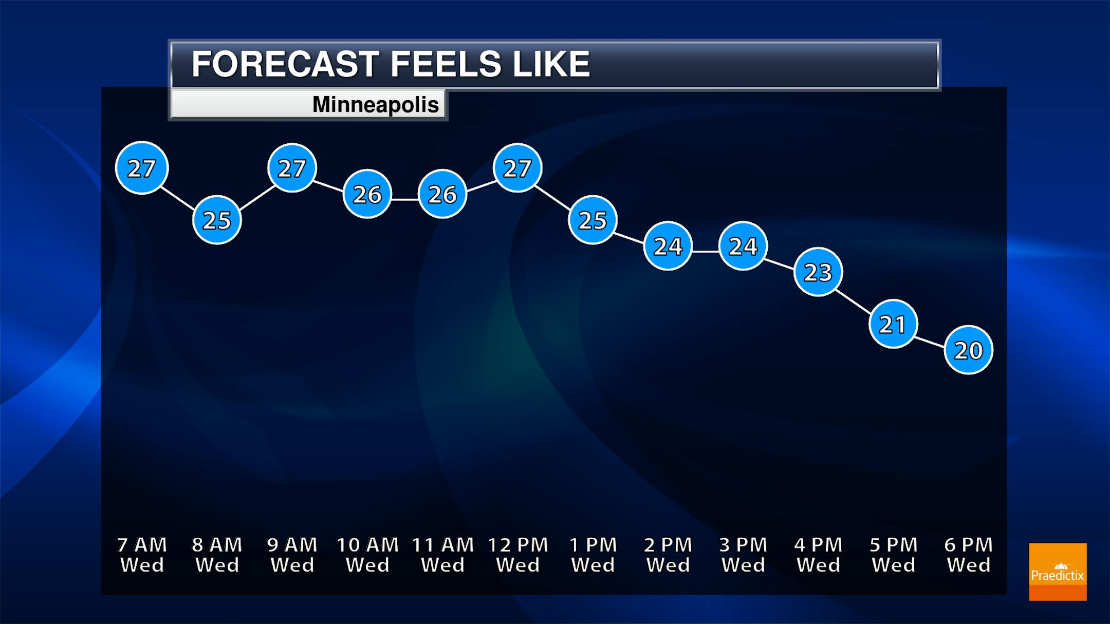 Feels like temps for Minneapolis on Wednesday will be in the 20s through much of the day.
