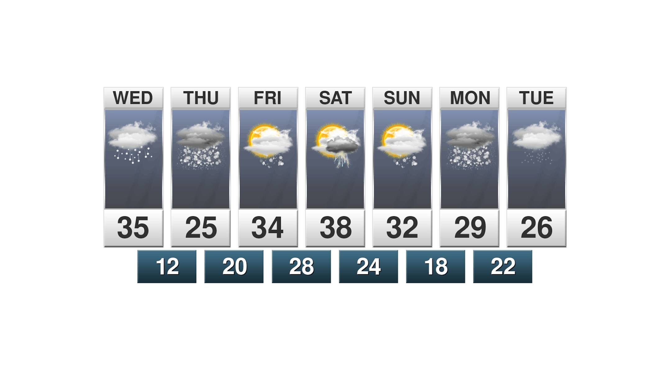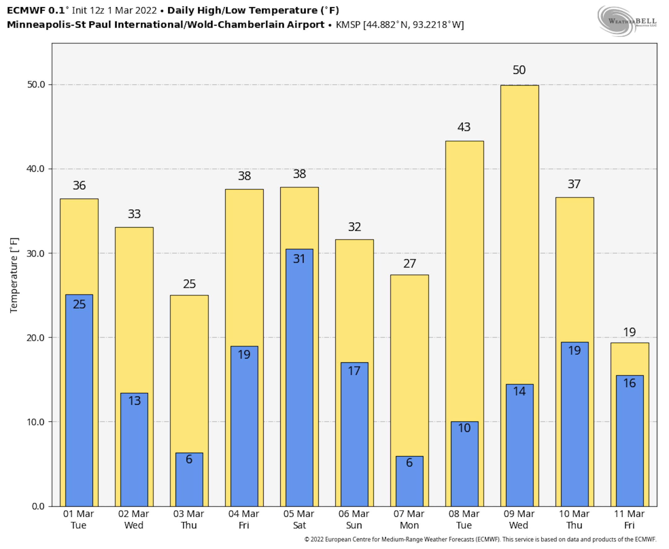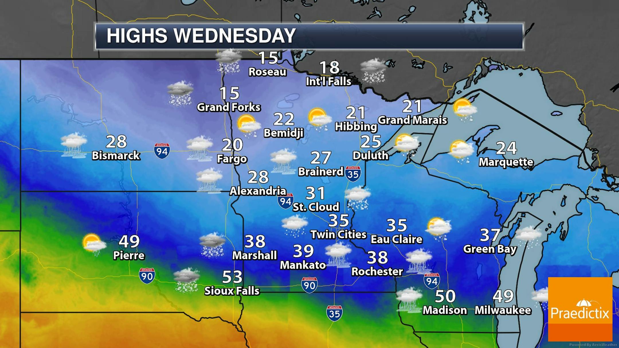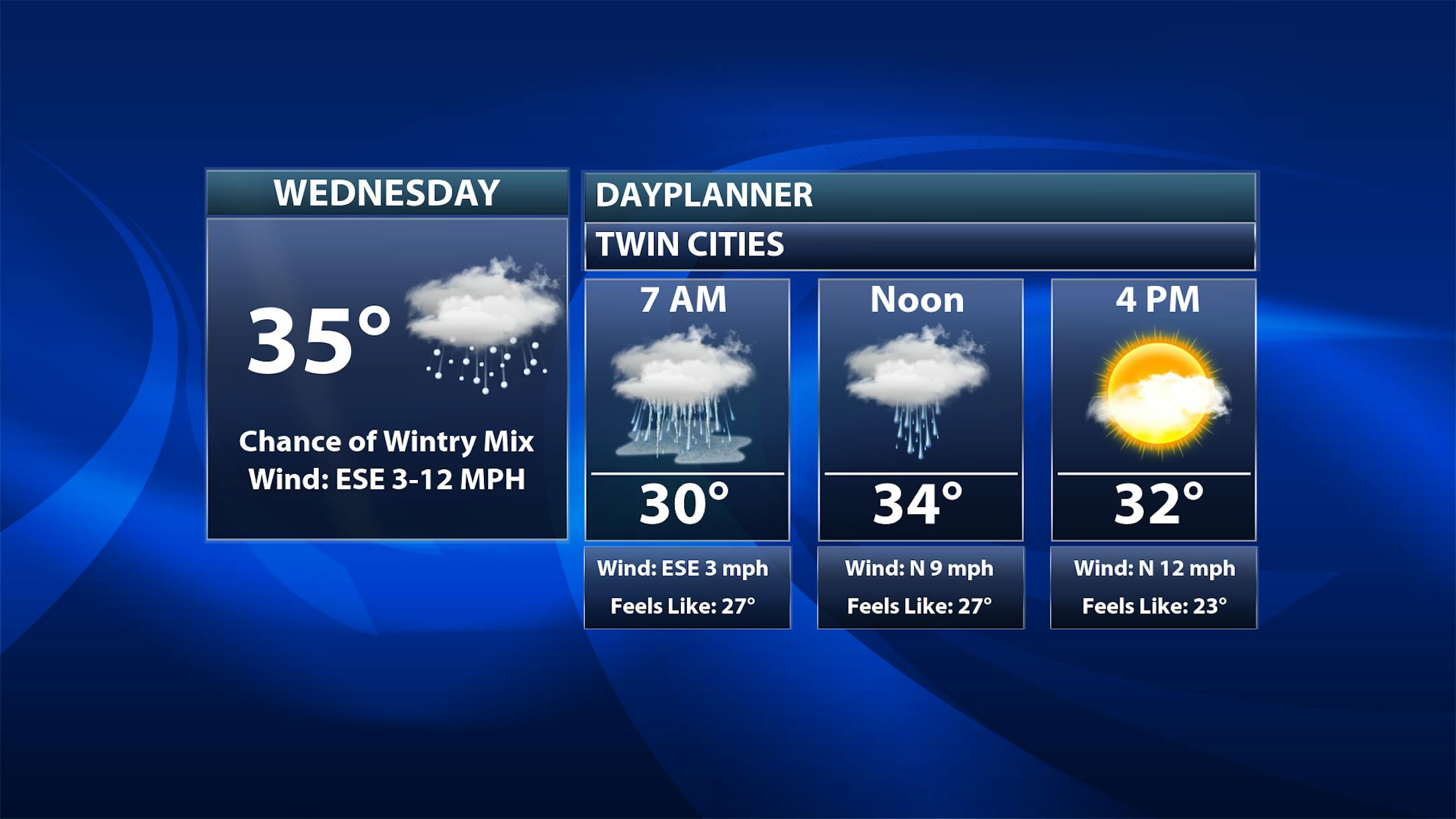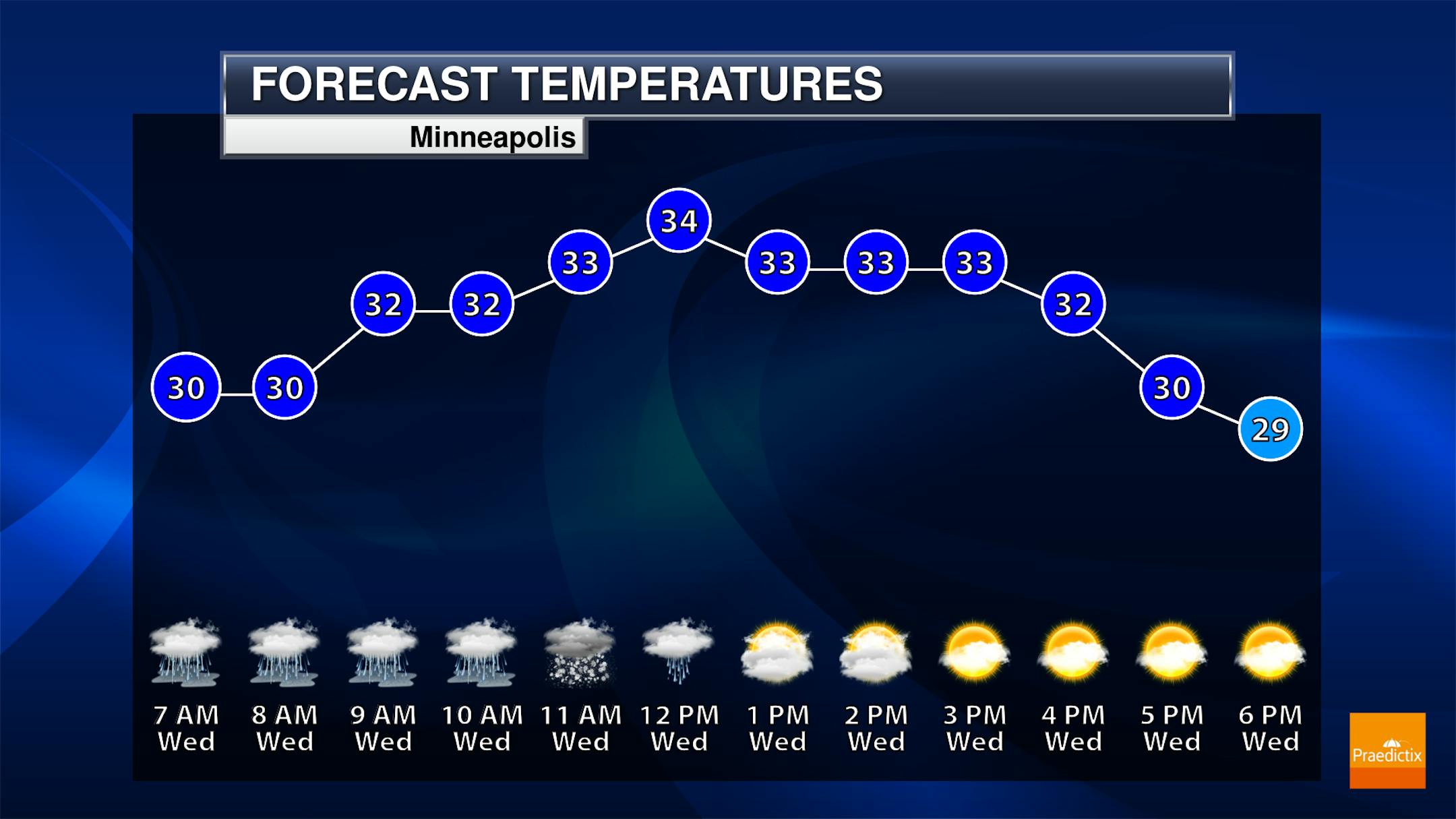 The hourly temps for Minneapolis on Wednesday show temps starting around 30F in the morning and topping out in the mid 30s by the afternoon. Northerly winds will blow around 20mph through the day.
