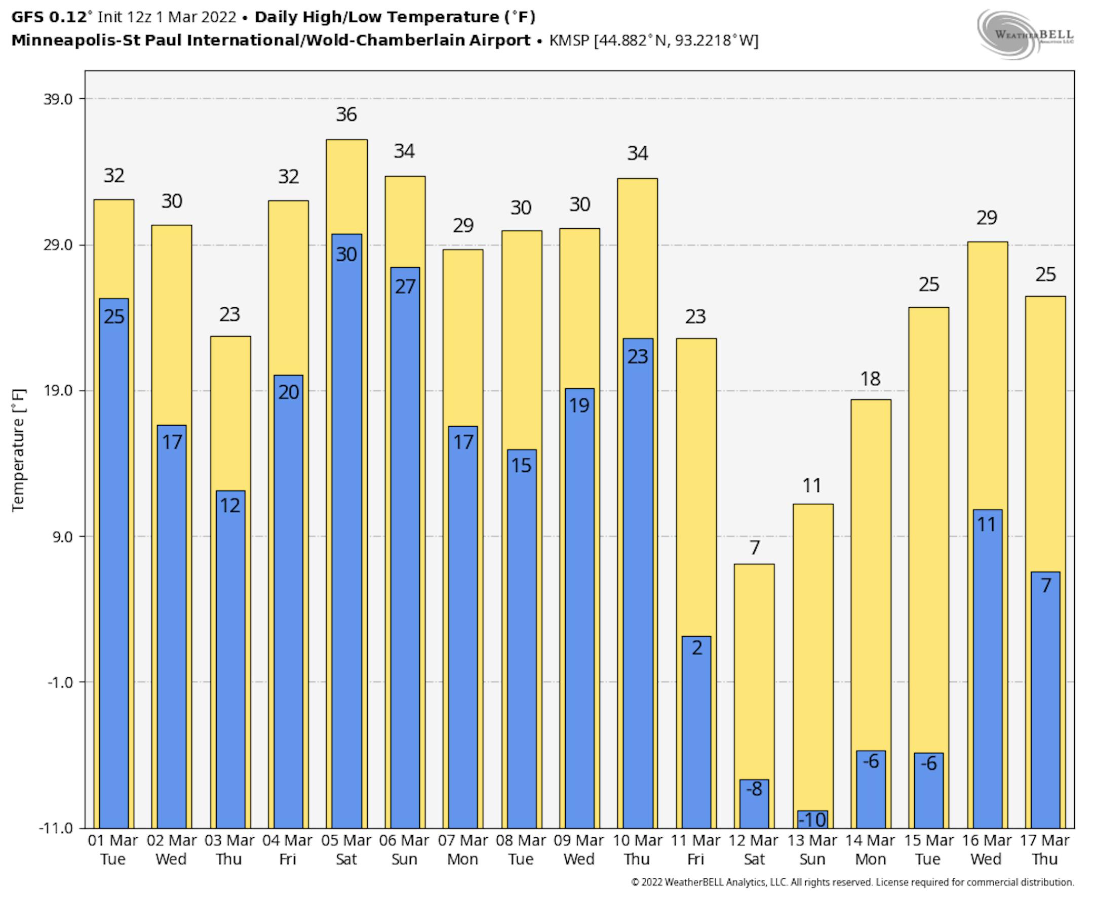 The extended temperature outlook for Minneapolis over the next several days shows near average temps through on Wednesday, but will be nearly -10F below average on Thursday. We get back to near average levels on Friday and again this weekend.
