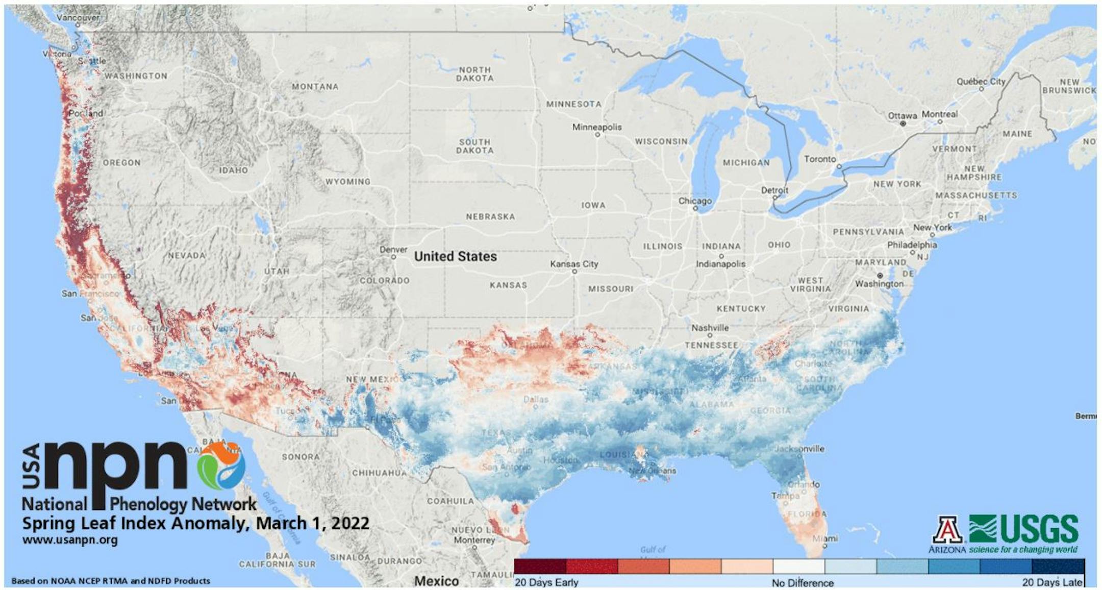 "February 28, 2022 - Spring leaf out continues to progress north through southern and western states. Our spring leaf anomaly compares the arrival of spring leaf out this year to a long-term average of 1991-2020. Spring leaf out started arriving over a week early in the southernmost part of Texas and Florida and then slowed, arriving one-two weeks late across much of the Southeast. In the last couple weeks, spring is progressing more rapidly, arriving a few days to a week early in the southern Great Plains and parts of North Carolina and Virginia. In western states, spring leaf out is patchy, arriving a week late in some locations and over a month early in others. Spring bloom has also started to arrive in southern states, days to a week late in Texas and Florida and days to several weeks early in California. Spring bloom is slightly early in South Carolina."