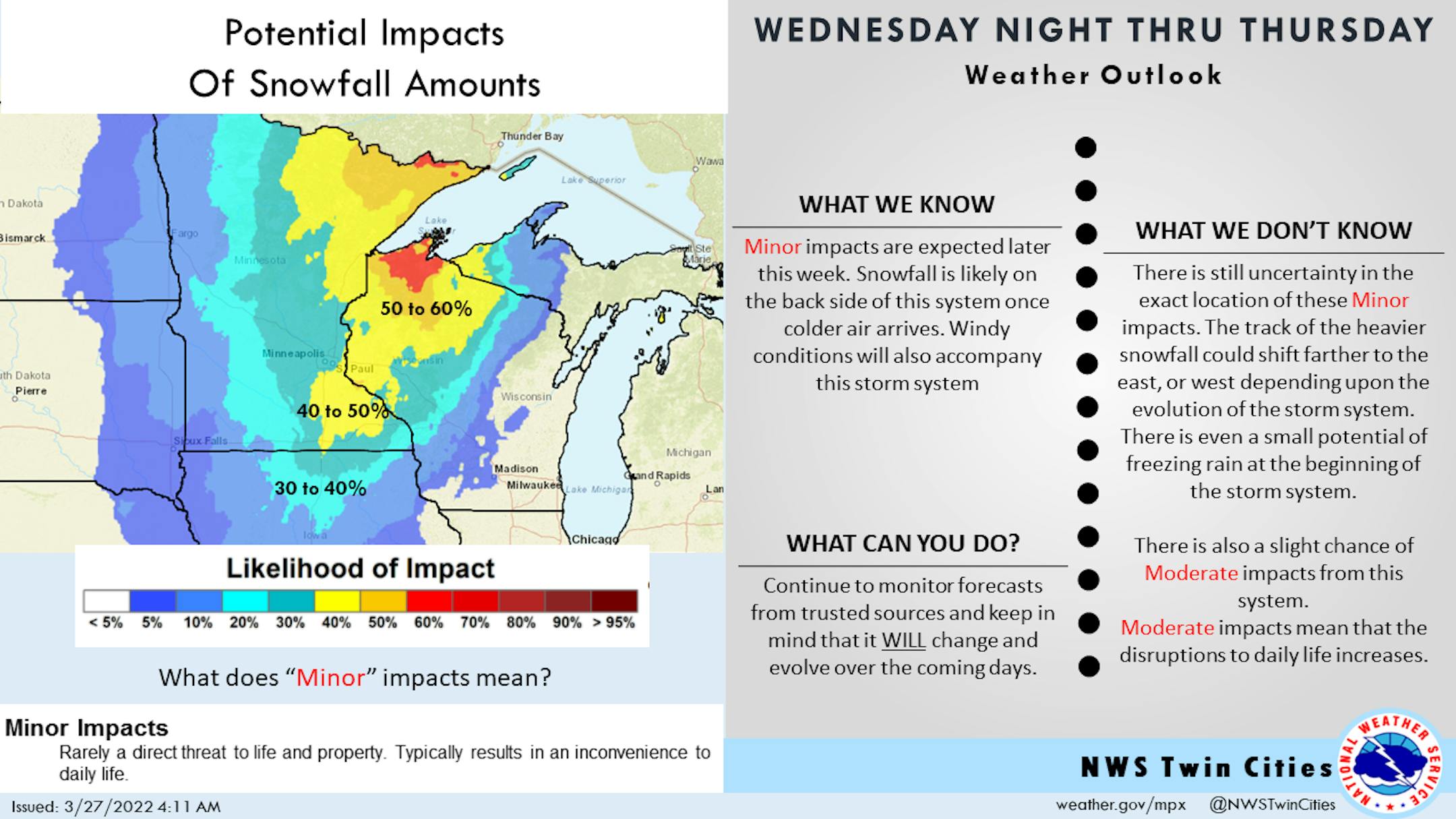 "A strong system is expected to impact the Upper Midwest by midweek. Heavy precipitation and mixed precipitation are expected. The location of the heaviest precipitation and precipitation type remains uncertain. Continue to monitor the forecast for updates as the week progresses. The image is an experimental probabilistic Winter Storm Severity Index. It illustrates the potential impacts of minor, moderate, major or extreme depending upon snow amounts, snow rate, snow load, ice accumulation and blowing snow."