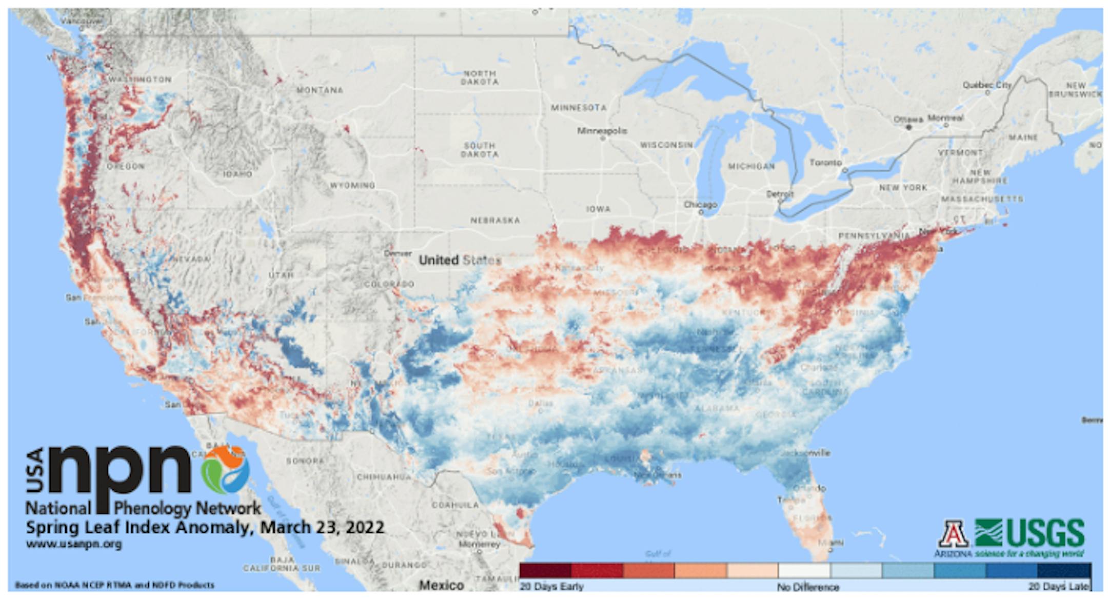 "March 21, 2022 - Spring leaf out continues to progress across the country. Our spring leaf anomaly compares the arrival of spring leaf out this year to a long-term average of 1991-2020. After a slow start to spring across much of the Southeast, spring is progressing more rapidly, arriving a few days to a week early in the southern Great Plains, the Southern Appalachians, and parts of Kentucky, Ohio, and West Virginia. The Washington, D.C. area is 5-10 days early. Parts of New York City are one week early. In western states, spring leaf out is patchy, arriving a week late in some locations and over a month early in others. Spring bloom has also started to arrive in southern states, days to a week late in Texas and Florida and days to several weeks early in California. Spring bloom is over a week early in parts of Georgia, South Carolina, and North Carolina. We will continue to update this page as spring leaf out and bloom unfold across the country - check back frequently on this page!"