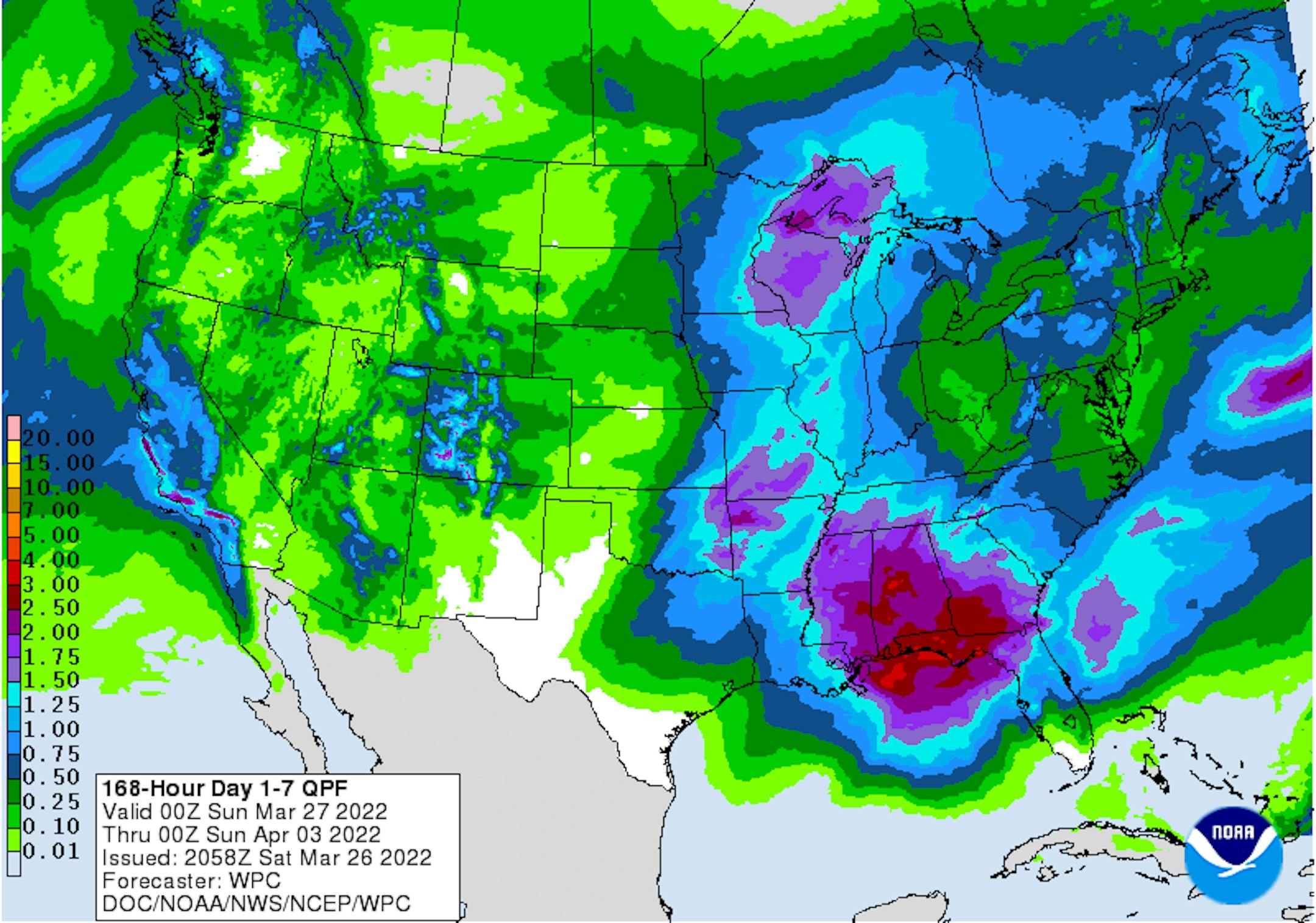 Here's NOAA's WPC extended precipitation outlook through Friday of next week. Early estimates suggest a pretty waterlogged storm system moving through with up to or more than 1" of liquid possible. Stay tuned...