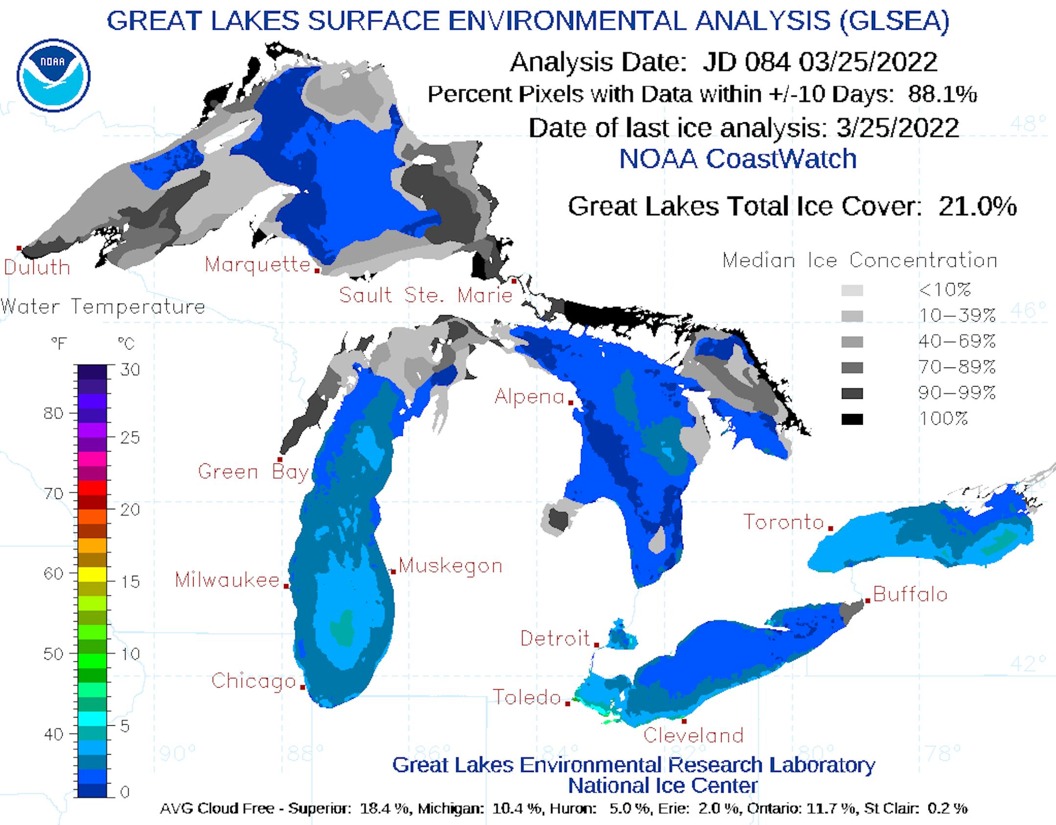 According to NOAA's GLERL, near 21% of the great lakes is considered ice covered. 36% of Lake Superior is ice covered.