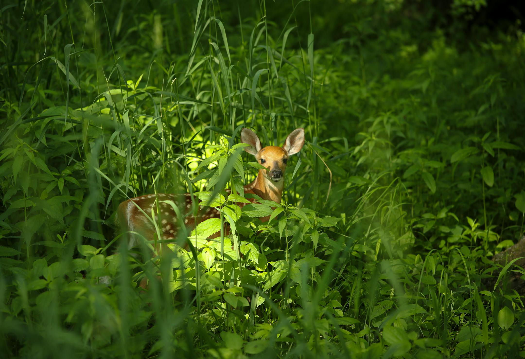 Mothers vigorously lick their newborn young with their rough tongues. This washing process may imprint the doe with the particular odor of her own young, enabling her to distinguish them from other fawns. A fawn, except for the nursing time, is inactive for the first three or four days of its life. During this time the fawn is protected by being odorless, or nearly so, and its spotted coat allows the fawn to blend into its surroundings. The doe returns to nurse the fawn about 10 times in a 24-hour period. Then she is off to eat a variety of plant materials.