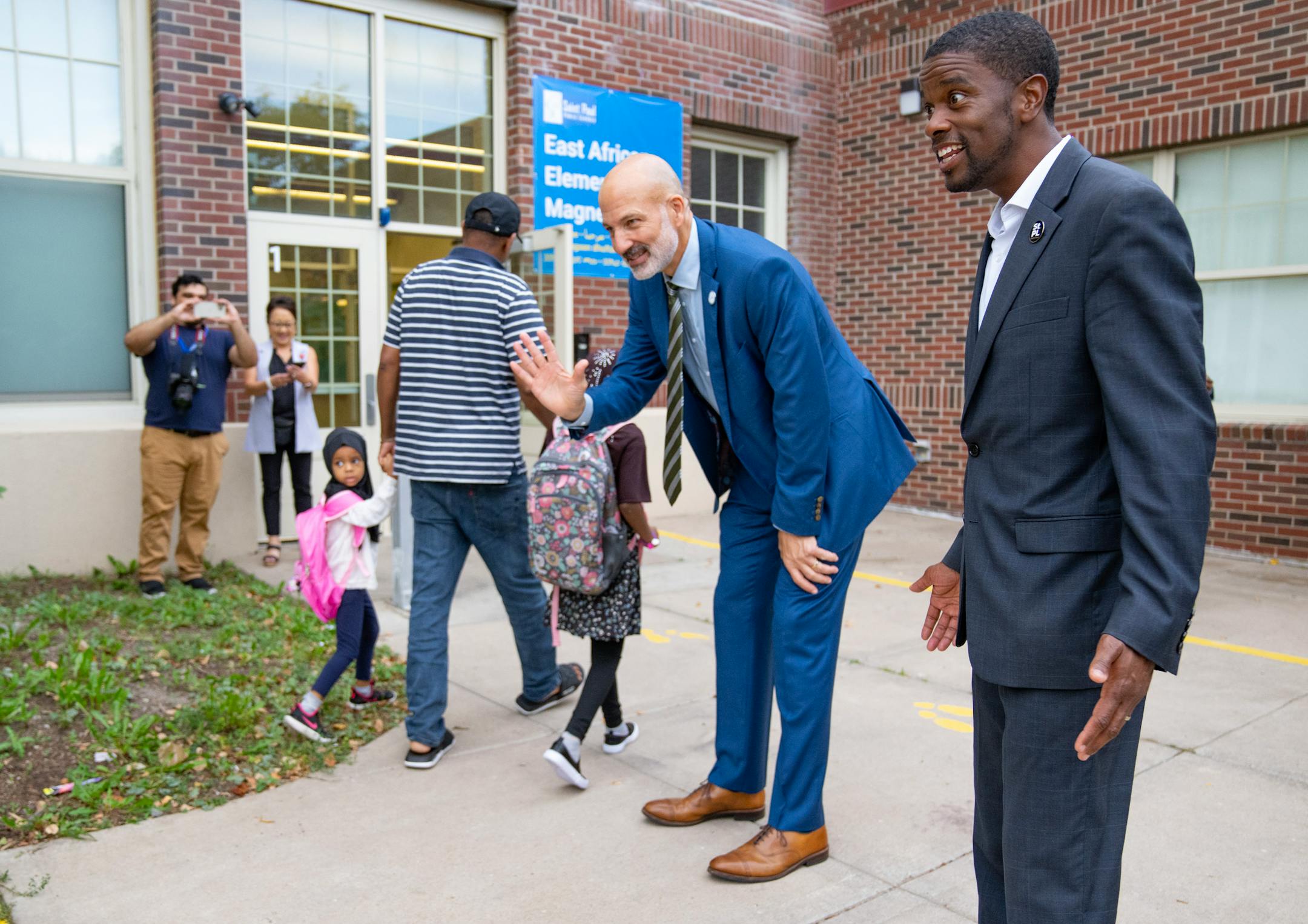 St. Paul Public Schools Superintendent Joe Gothard crouched to slap hands with students. Mayor Melvin Carter stopped by, as well.