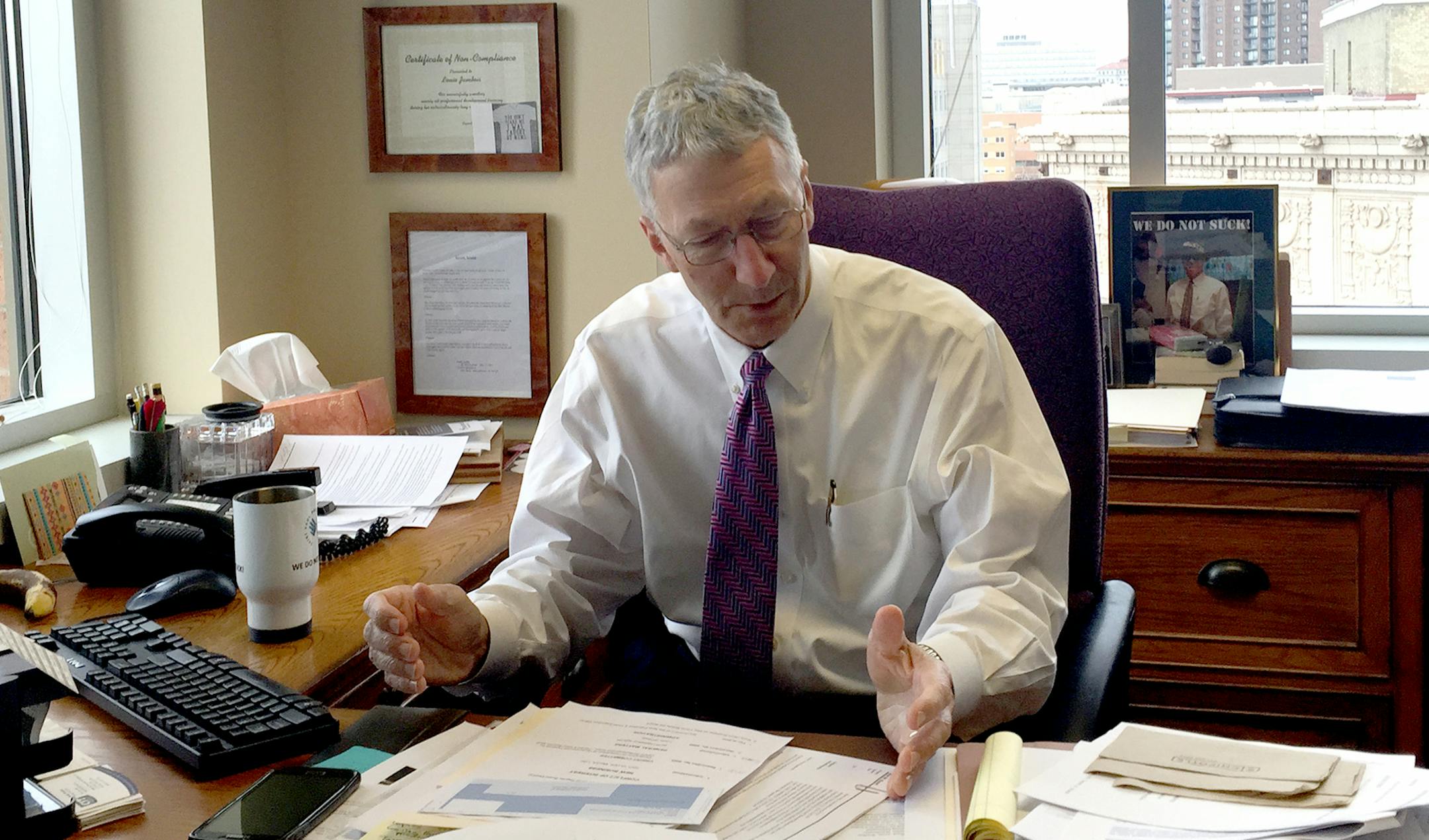Years of economic development work are documented in kitsch around Louis Jambois' office — commemorative plaques, baseballs from the St. Paul Saints, a Ramsey County hard hat.