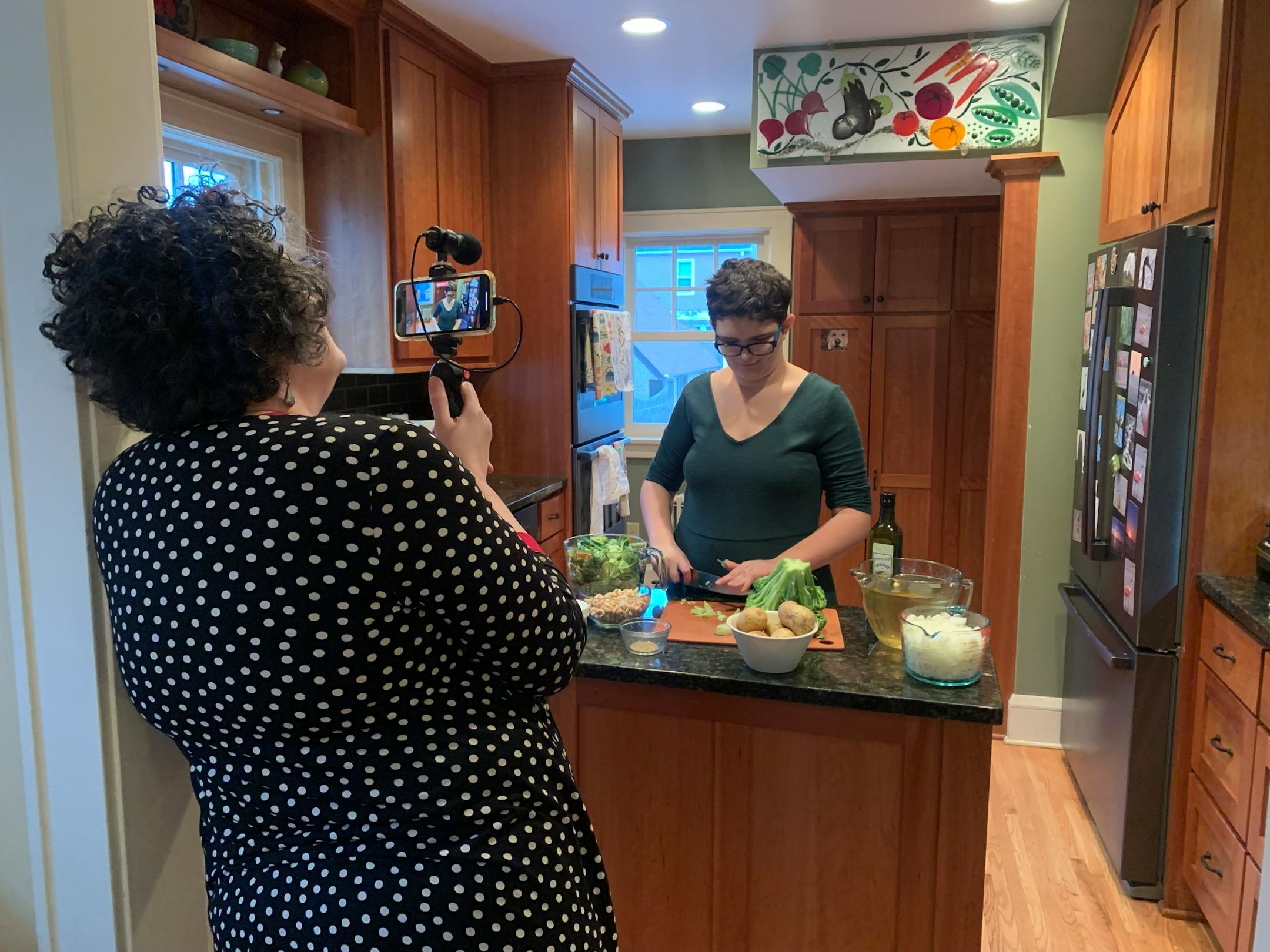 Across the small kitchen island, Netta's mom, Allyson Perling, is holding an iPhone with a microphone and tripod attached. She moves swiftly around the room, capturing close-ups of the ingredients while repeating a simple prompt: "What are you doing, Netta?"