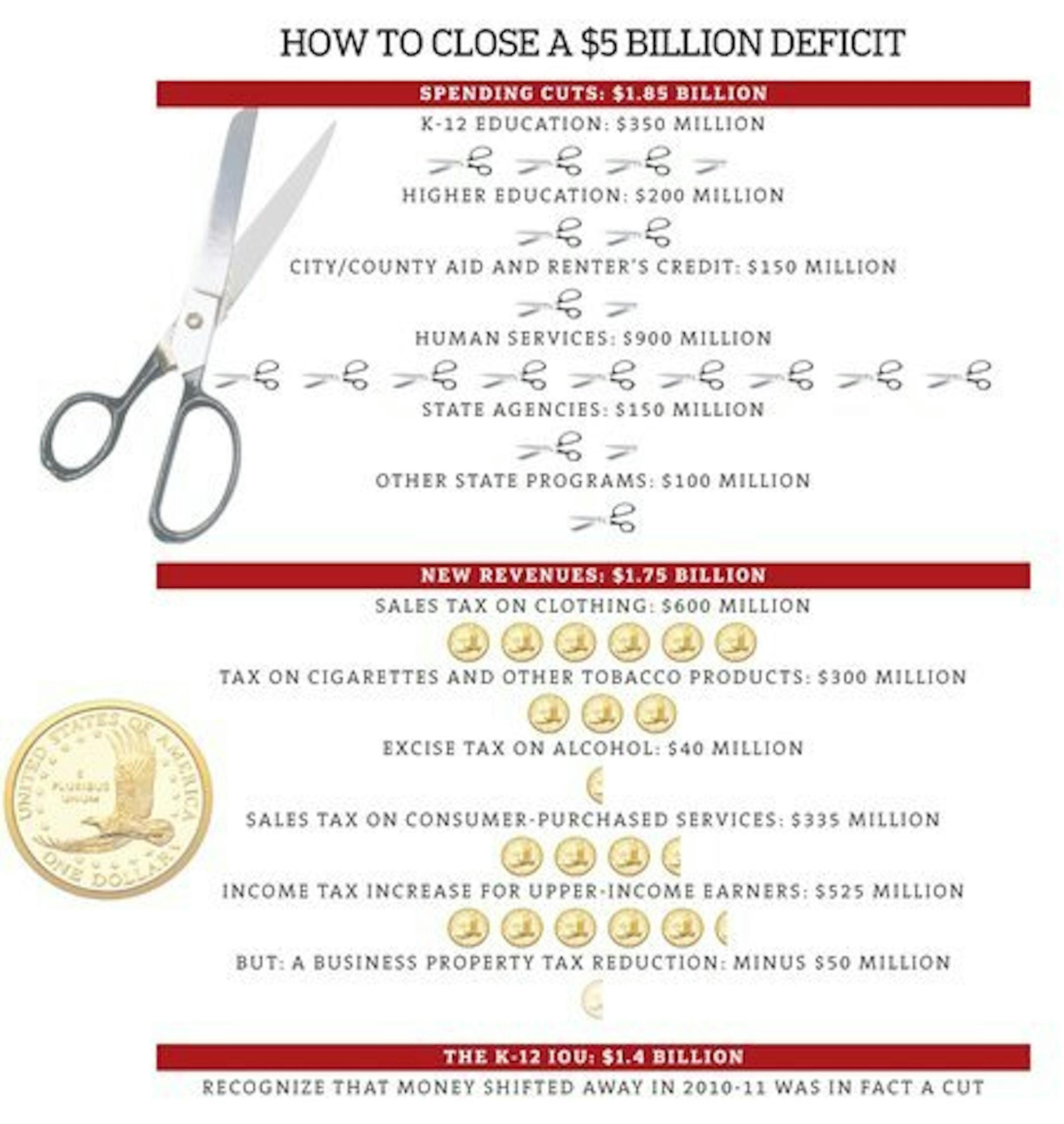 The Star Tribune's proposed budget closes the state's $5 billion forecasted gap between program costs and expected revenues with a mix of tax increases, spending cuts and a delay in a promised IOU payment to school districts.