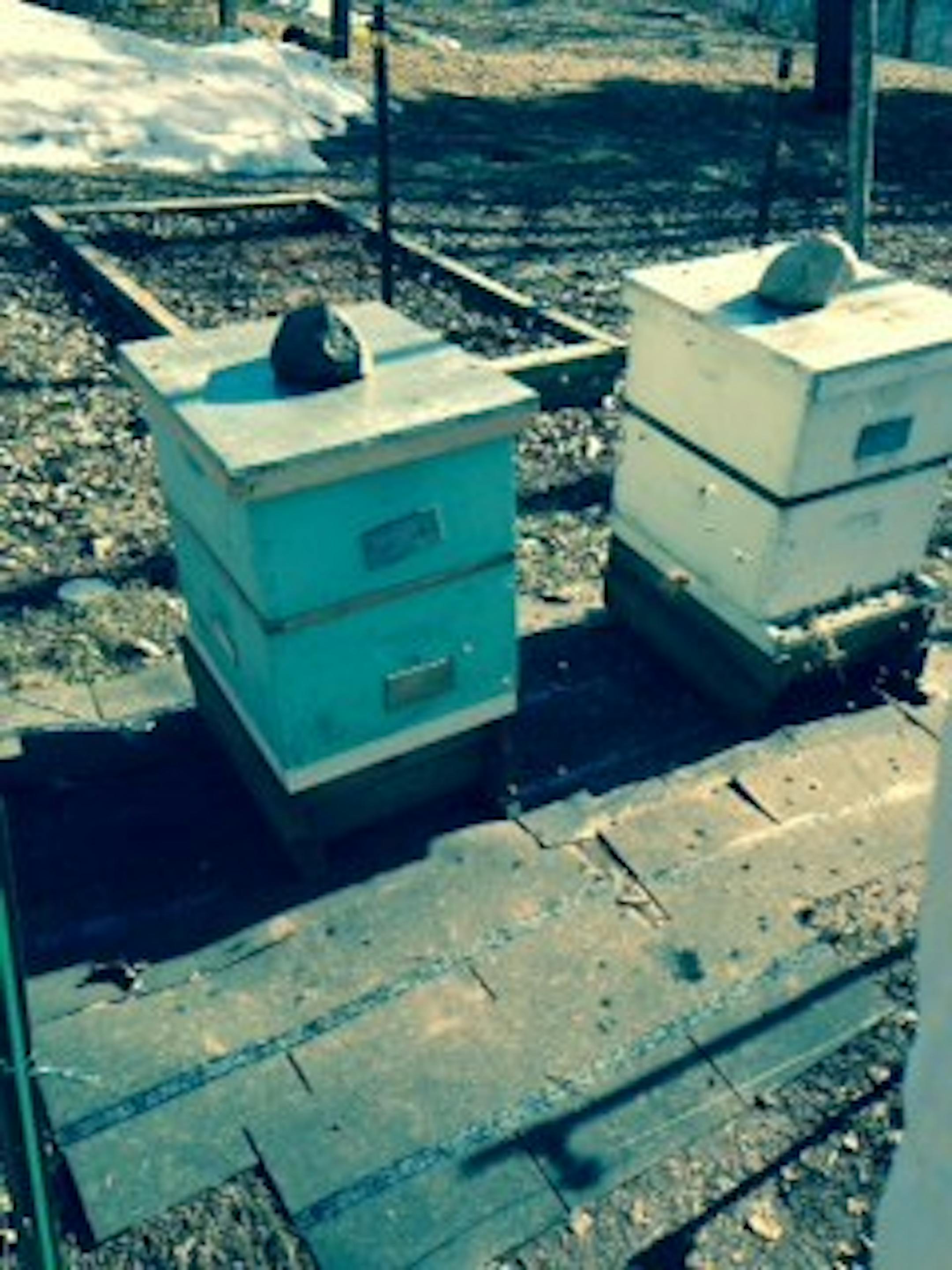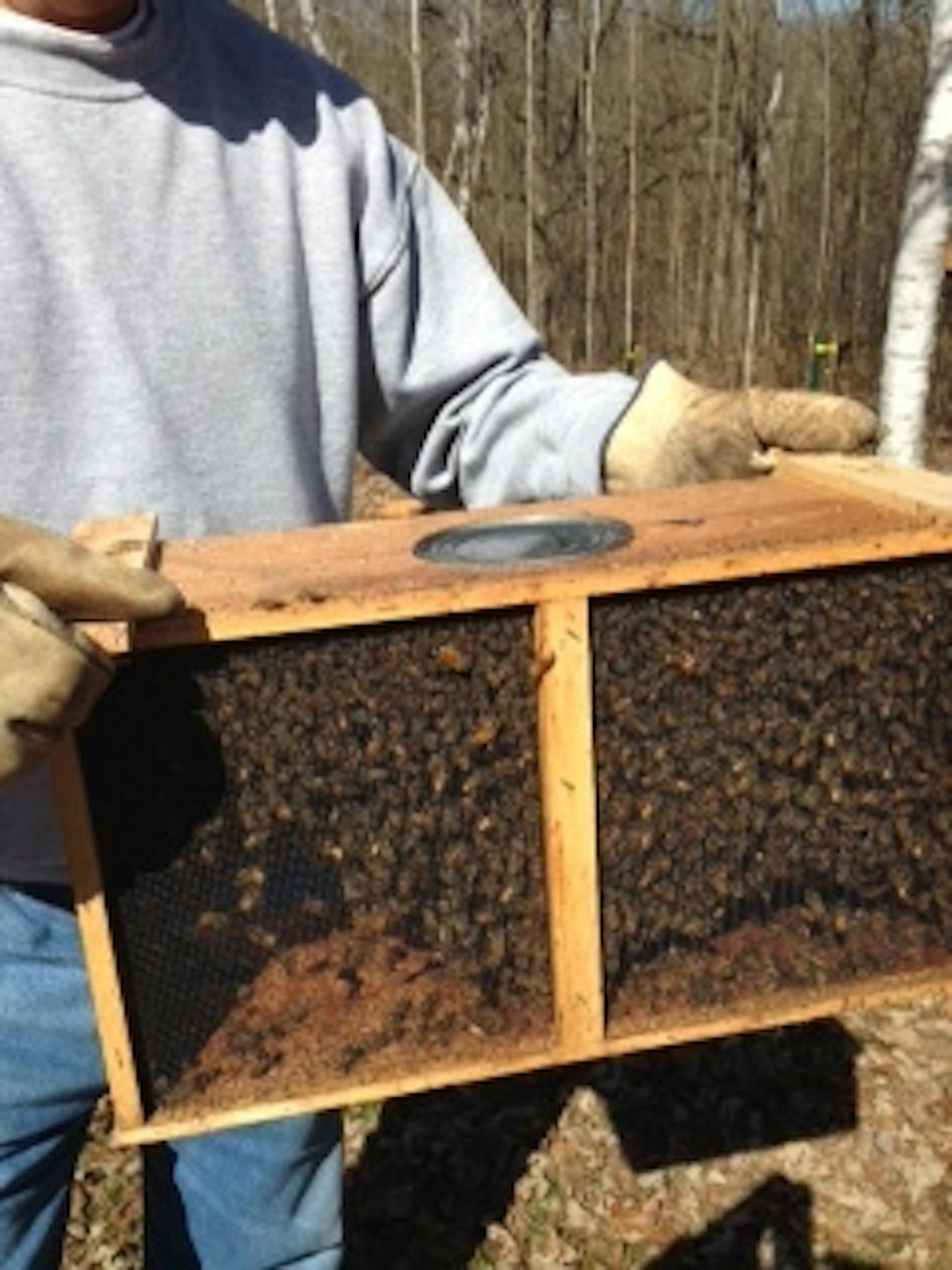 The next morning, the bees were out and about checking out the neighborhood. The apiary is in a good location, basswood trees, dogwood bushes and plenty of water within a mile. Nothing blooming at the time, but they have sugar water (carbohydrates) and substitute pollen (protein), so they have what it takes to start working on growing the hives. (Little did the bees know that it would be SNOWING this morning!)