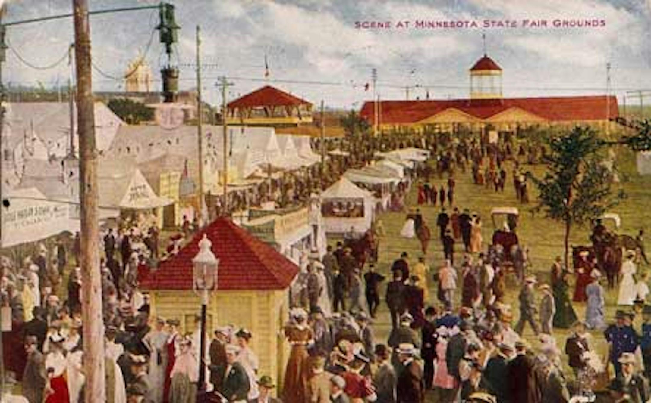 I'm done with the Fair this year, having done my part for Strib and country, but I can't let the last day go without posting some ephemera. Here's a picture of the Fair in its early days, when it was not so organized or permanent-looking as today: