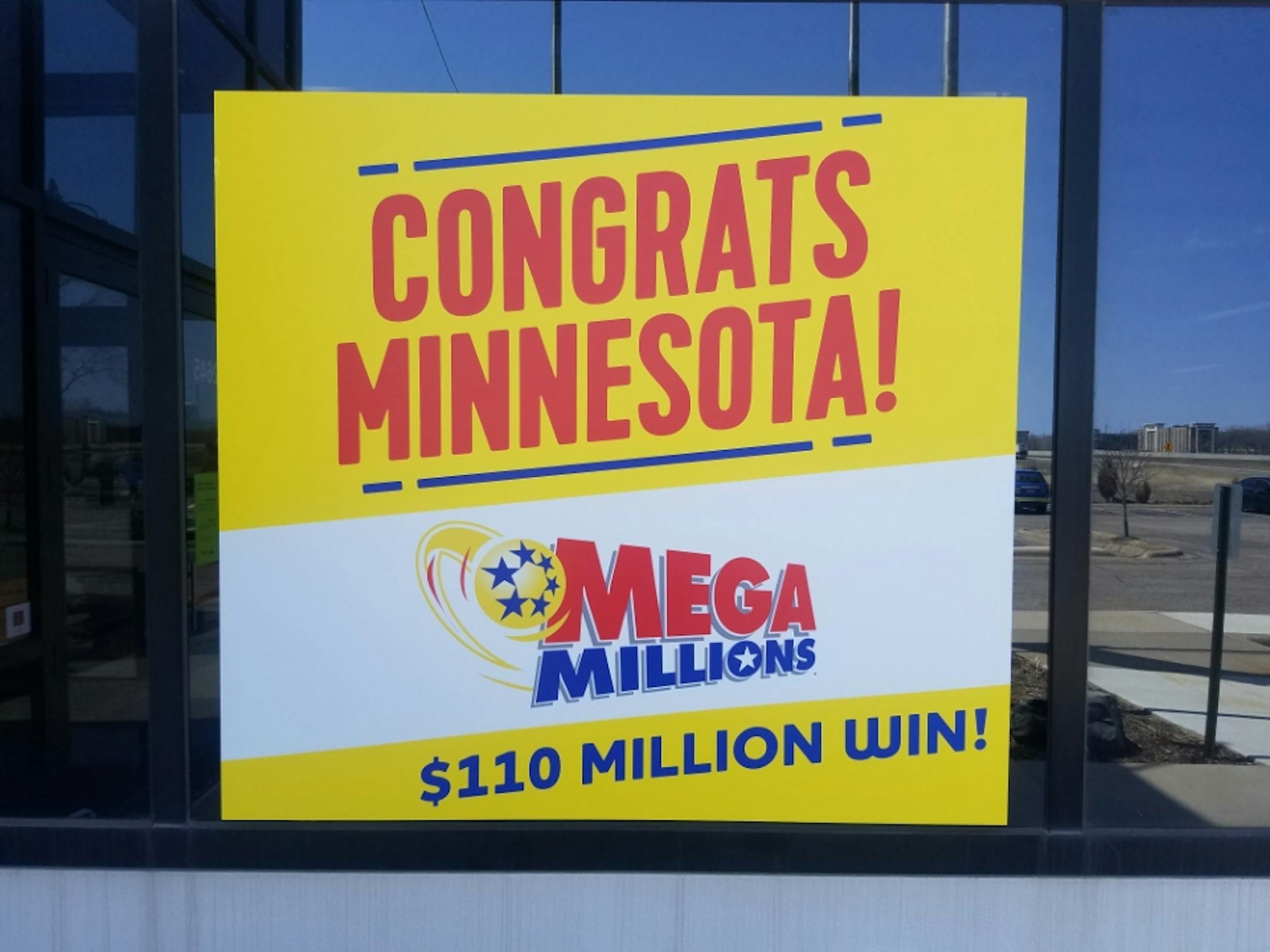 A sign outside Minnesota Lottery headquarters celebrates the state’s first Mega Millions jackpot winner. (Tim Harlow/The Minnesota Star Tribune)