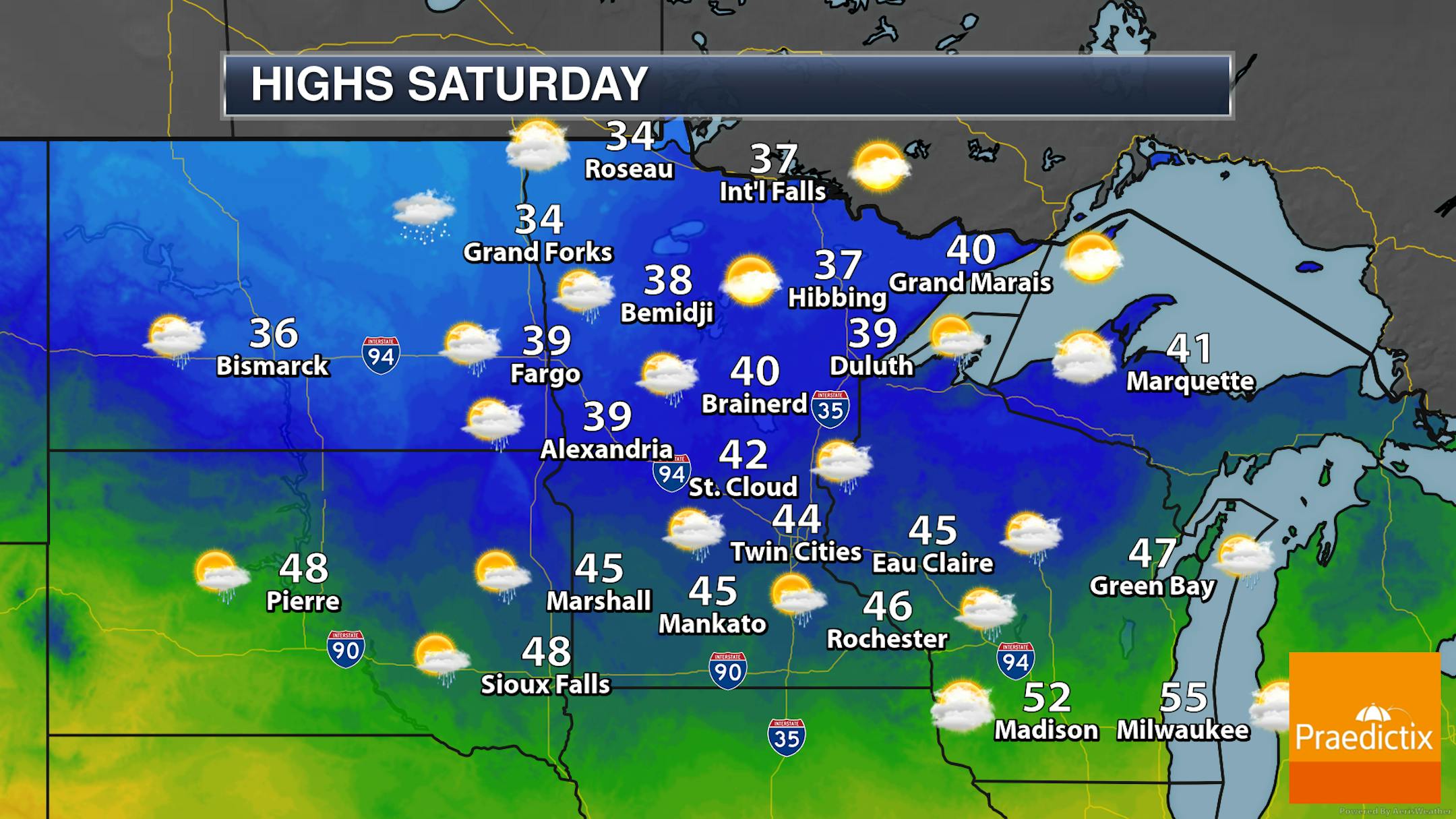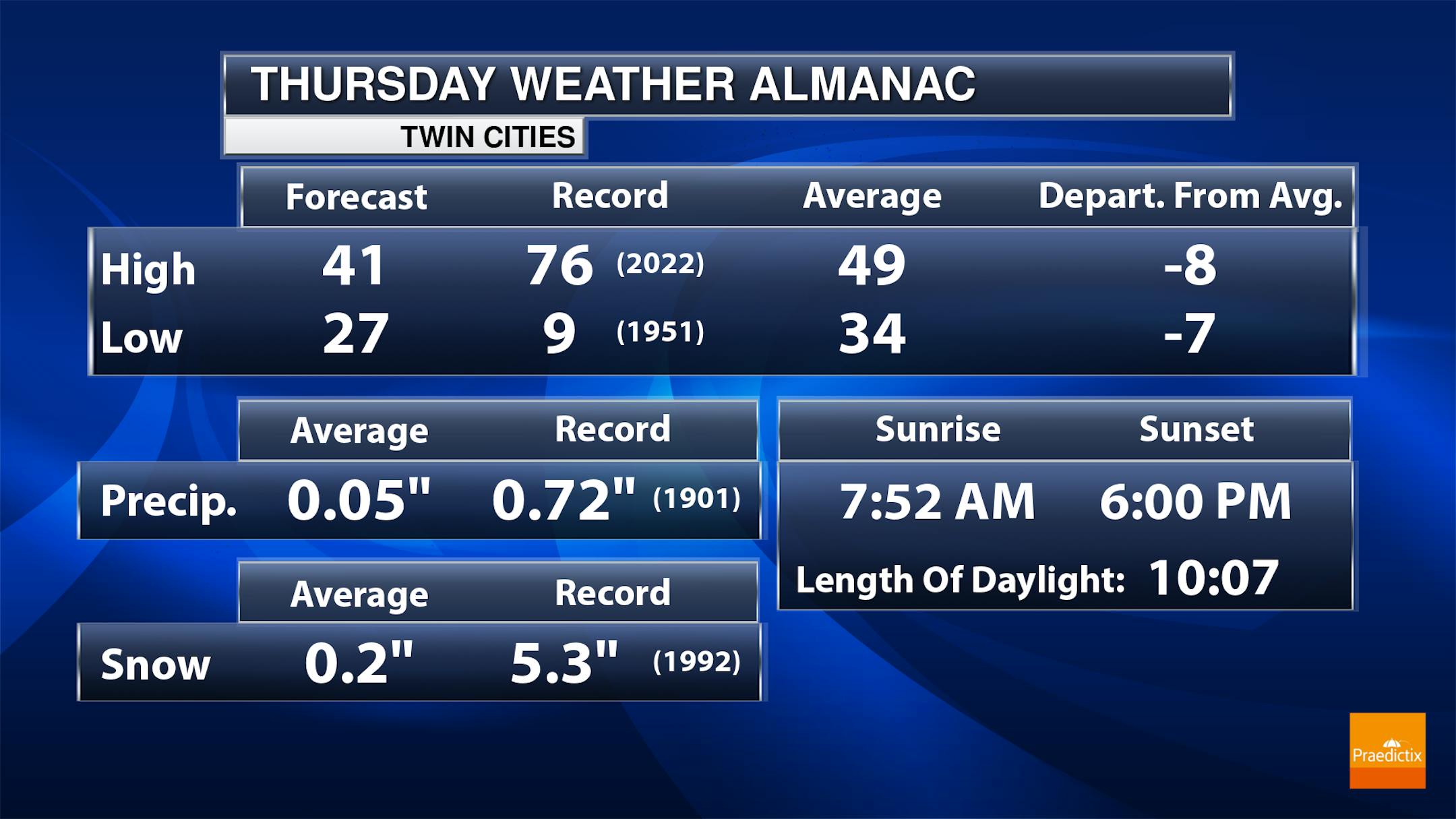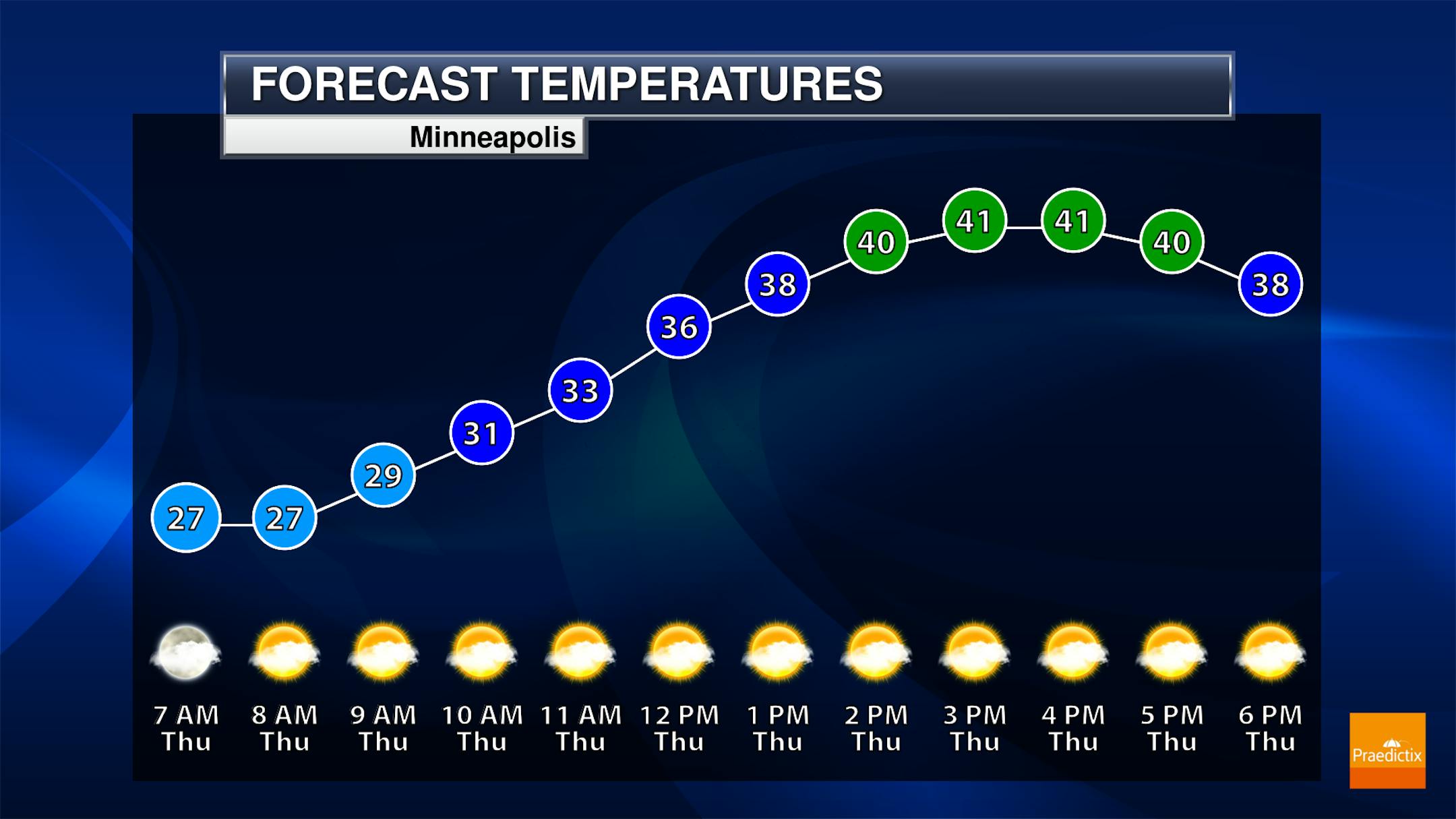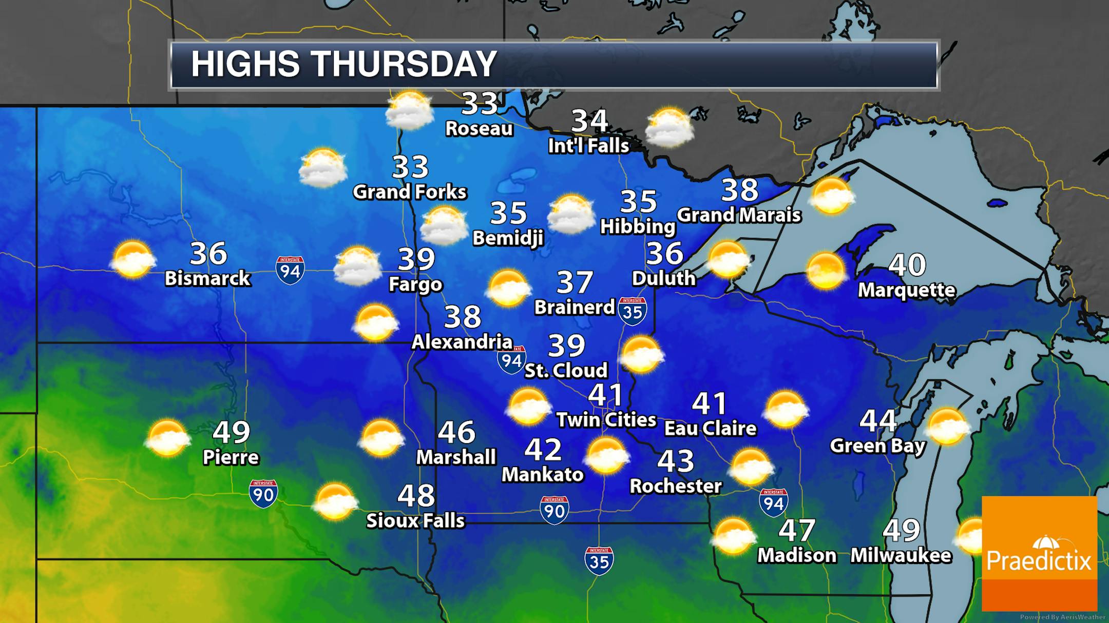 We'll see passing clouds as we head through Thursday in the Twin Cities with lighter winds in place. Morning temperatures start off in the upper 20s with highs topping off in the low 40s.