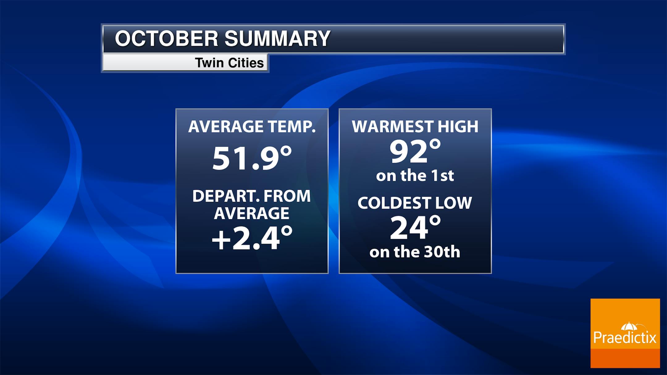 Looking back at October, now that we have reached November, we were above average across the board in the Twin Cities. The average temperature of 51.9F was the 37th warmest October on record and 2.4F above average. Two 1"+ rainfall days during the month helped lift the rainfall total for the month to 4.50" - the 15th wettest October on record. It was also the 10th snowiest October with 2.7" - with all of the accumulating snow falling on the 30th and 31st.