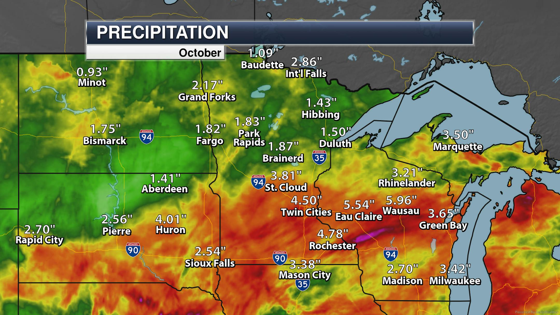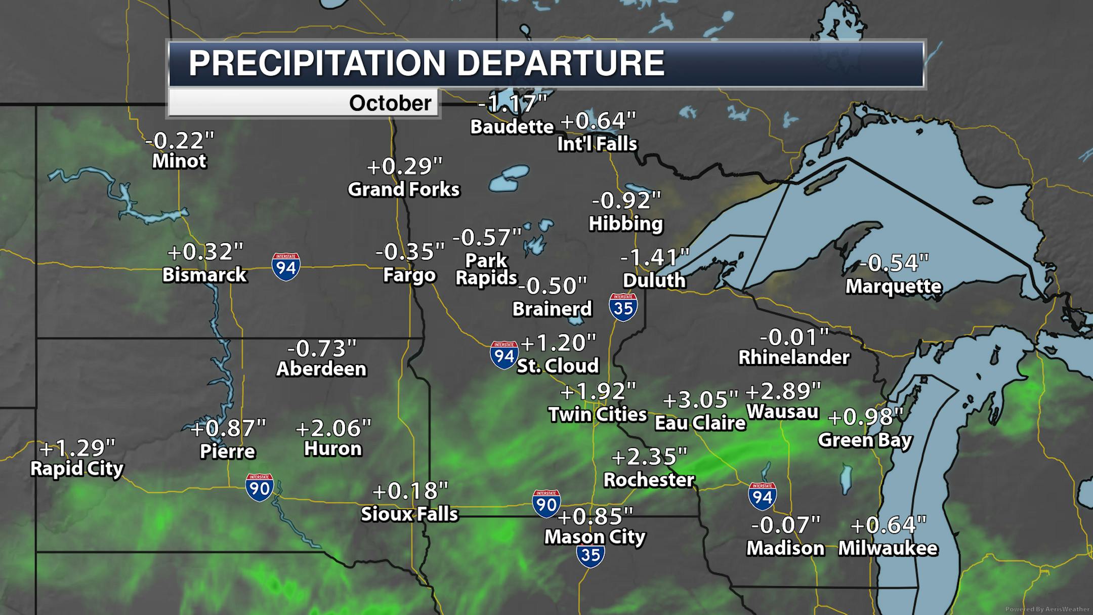 Southern Minnesota got socked with several rain events during the month of October, leading to rainfall amounts that were 1-2.5" above average. Meanwhile, northern Minnesota saw mostly below-average precipitation - the exception being International Falls.
