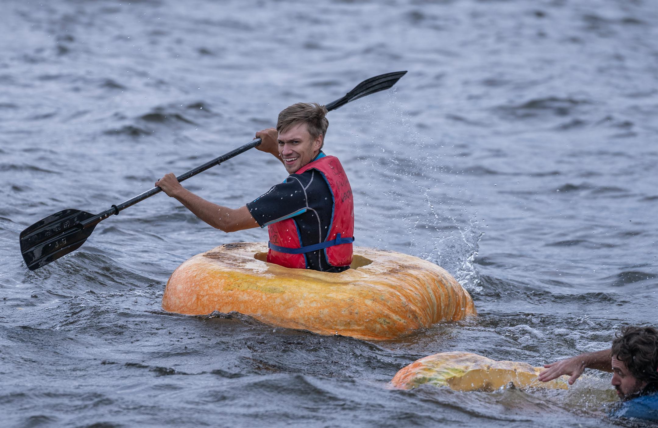 The pumpkin regatta, where “pilots” race in hollowed-out giant pumpkins, was a little different this year due to choppy waters created by more-than-30-mile-per-hour winds.