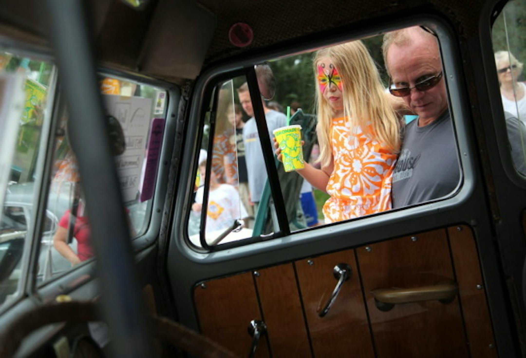 Bruce Olson, of Pine City, Minn., and granddaughter Cayli Hancoch browsed the Father's Day Car Show at last year's Stone Arch Bridge Festival. (photo by Renee Jones Schneider)