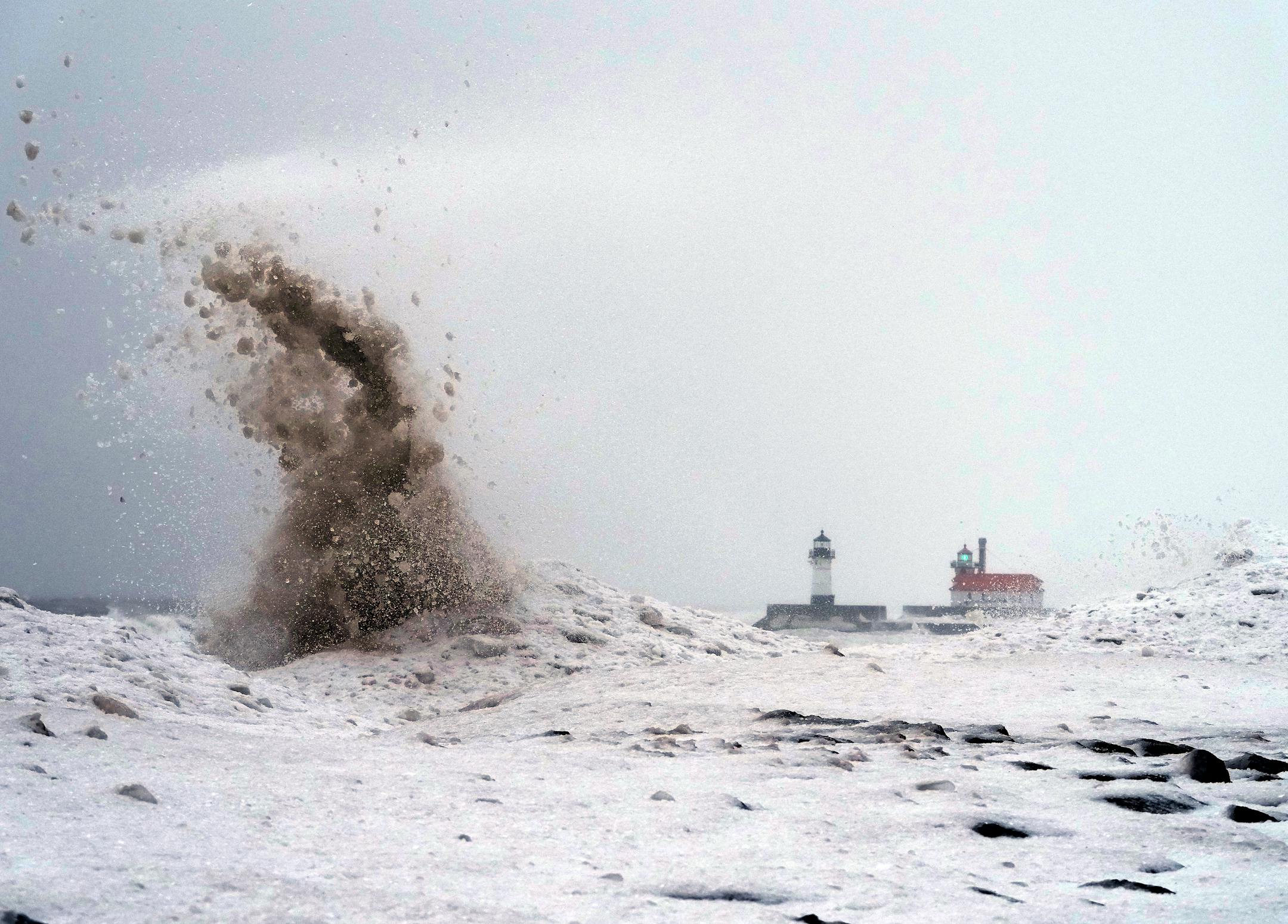 Lake Superior waves rolling into the Duluth-Superior Harbor reached higher than 10 feet, some cresting the seawall behind the Duluth Entertainment Convention Center. The city closed the road along the harbor there when the water froze. Pack ice pushing in to the shore eventually tamped down the waves' power.