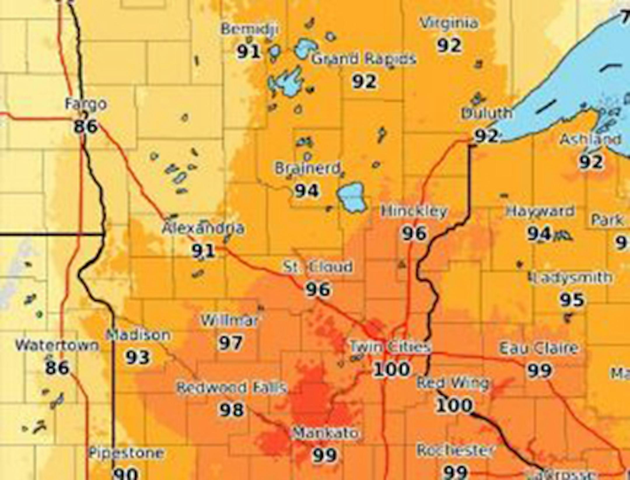 Temperatures in southern and central Minnesota climbed well into the 90s Saturday afternoon and high humidity made it feel even more oppressive. A brisk breeze, with gusts up to 30 miles per hour, didn't offer much relief.