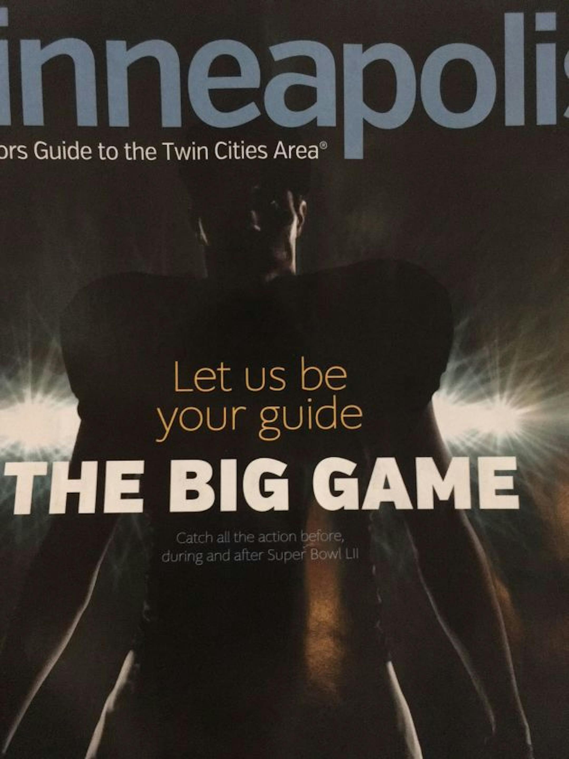 The 2018 "Minneapolis Official Visitors Guide to the Twin Cities Area" features a silhouetted football player on the cover and 32 pages promoting Minnesota brands and tourist-friendly activities.