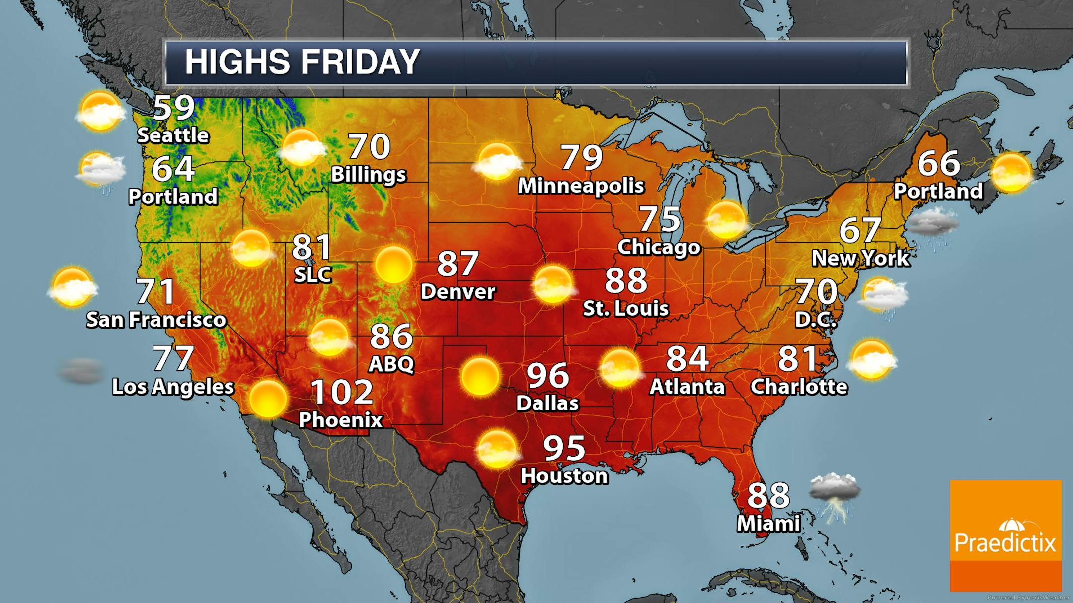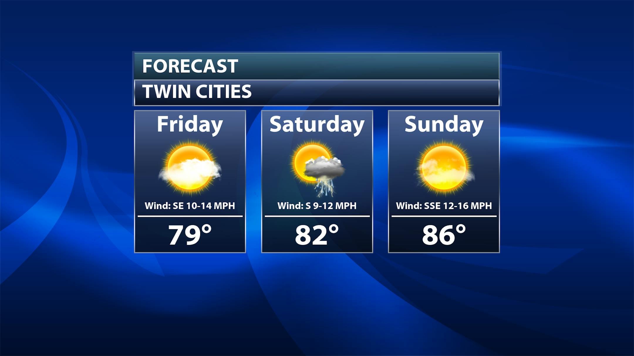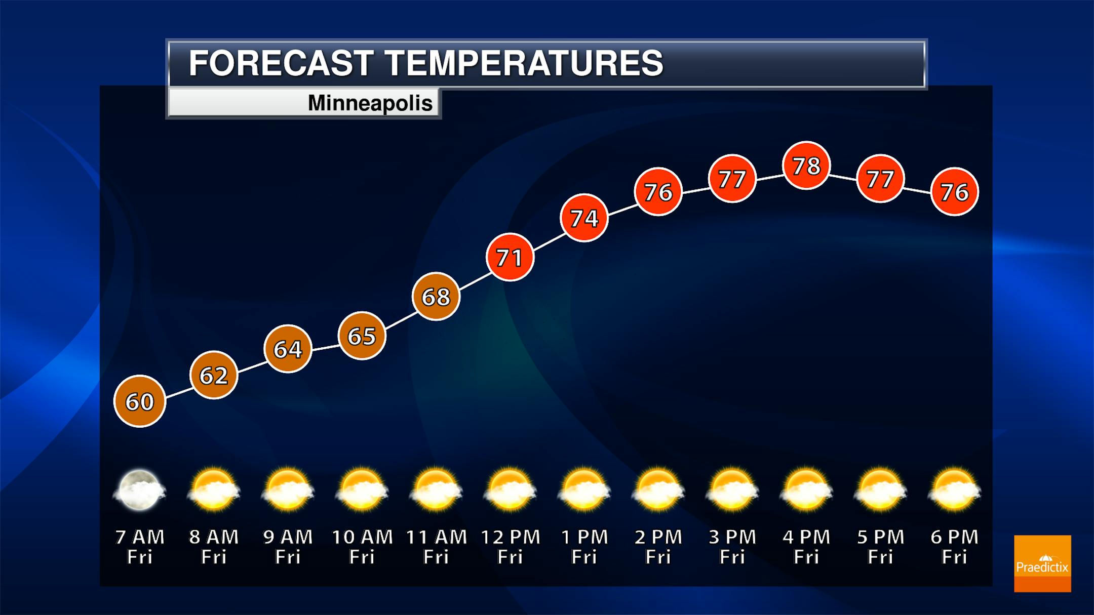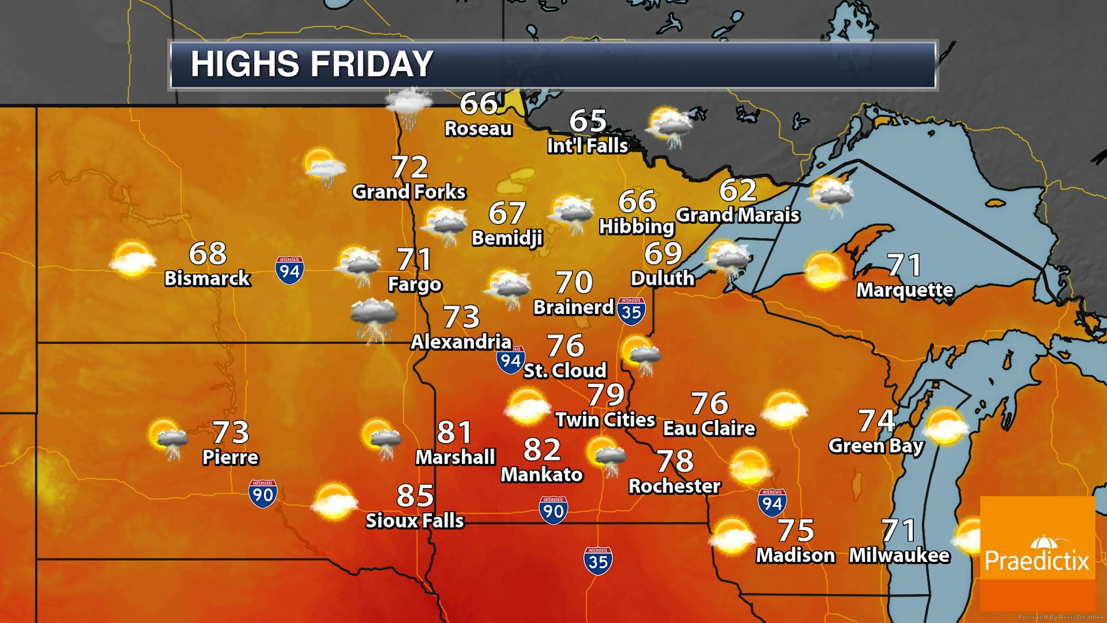 Friday looks to be another day with only partly sunny skies here in the metro. Rain chances look to mainly stay to our north. Morning temperatures start off around 60F with highs near 80F.