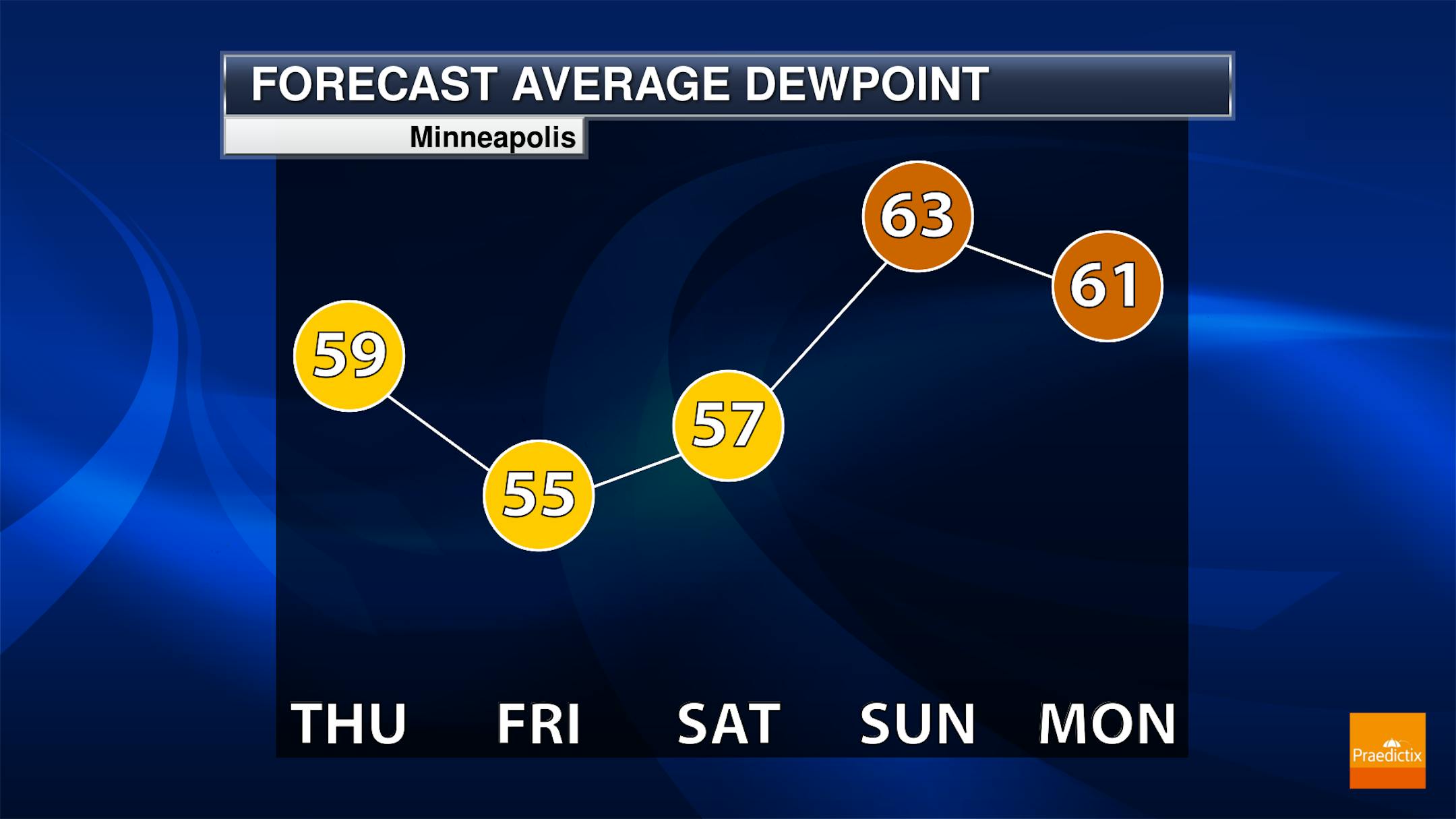 Dewpoints will climb as we head into the second half of the weekend, with 60F dewpoints expected to move in as soon as late Saturday lasting into Sunday. Some models have dewpoints reaching at least the mid-60s at times Sunday into early next week. So you will definitely notice a bit more humidity!
