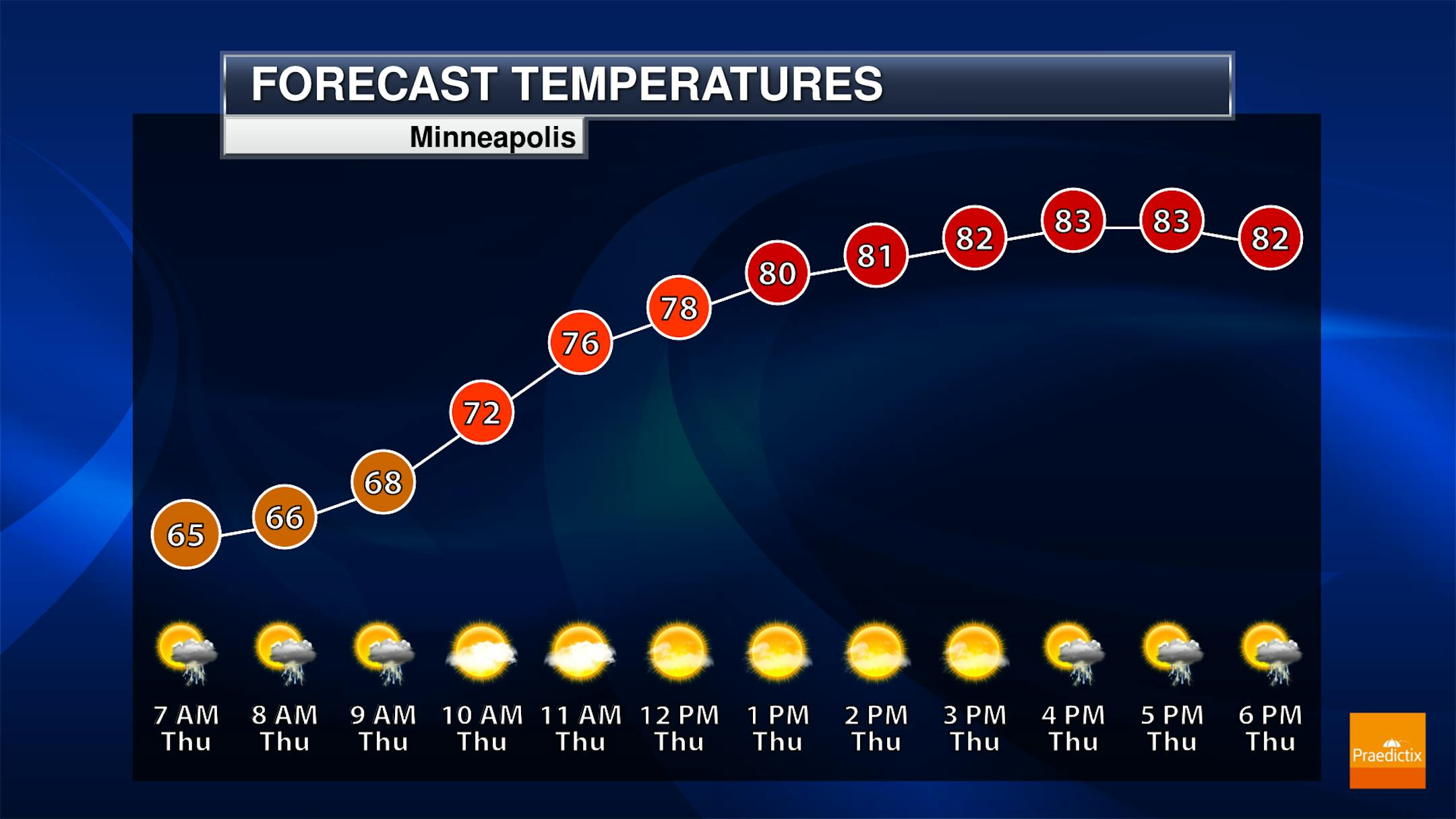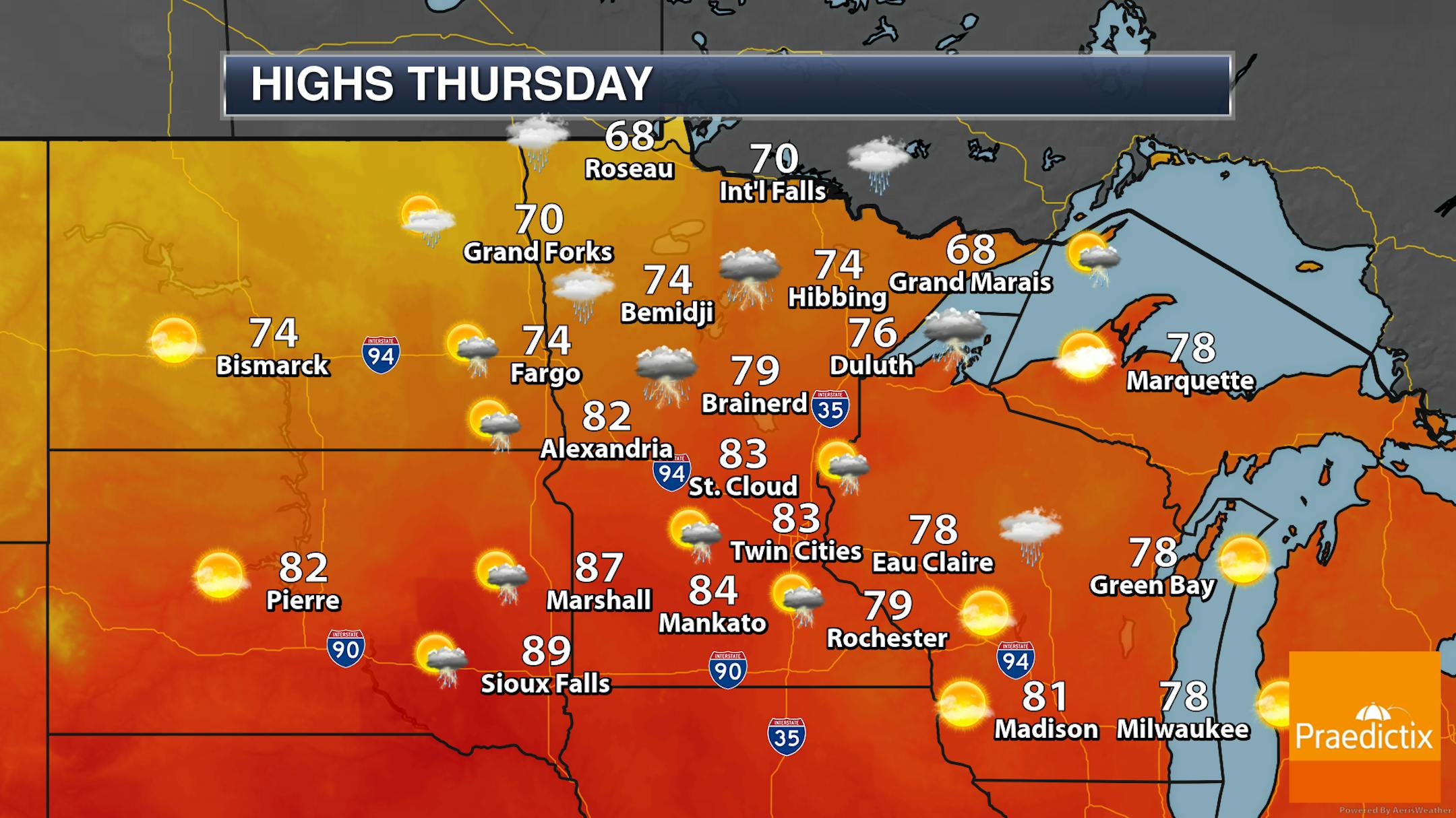 Highs will range from the upper 60s up in far northern Minnesota to near 90F in southwest Minnesota.