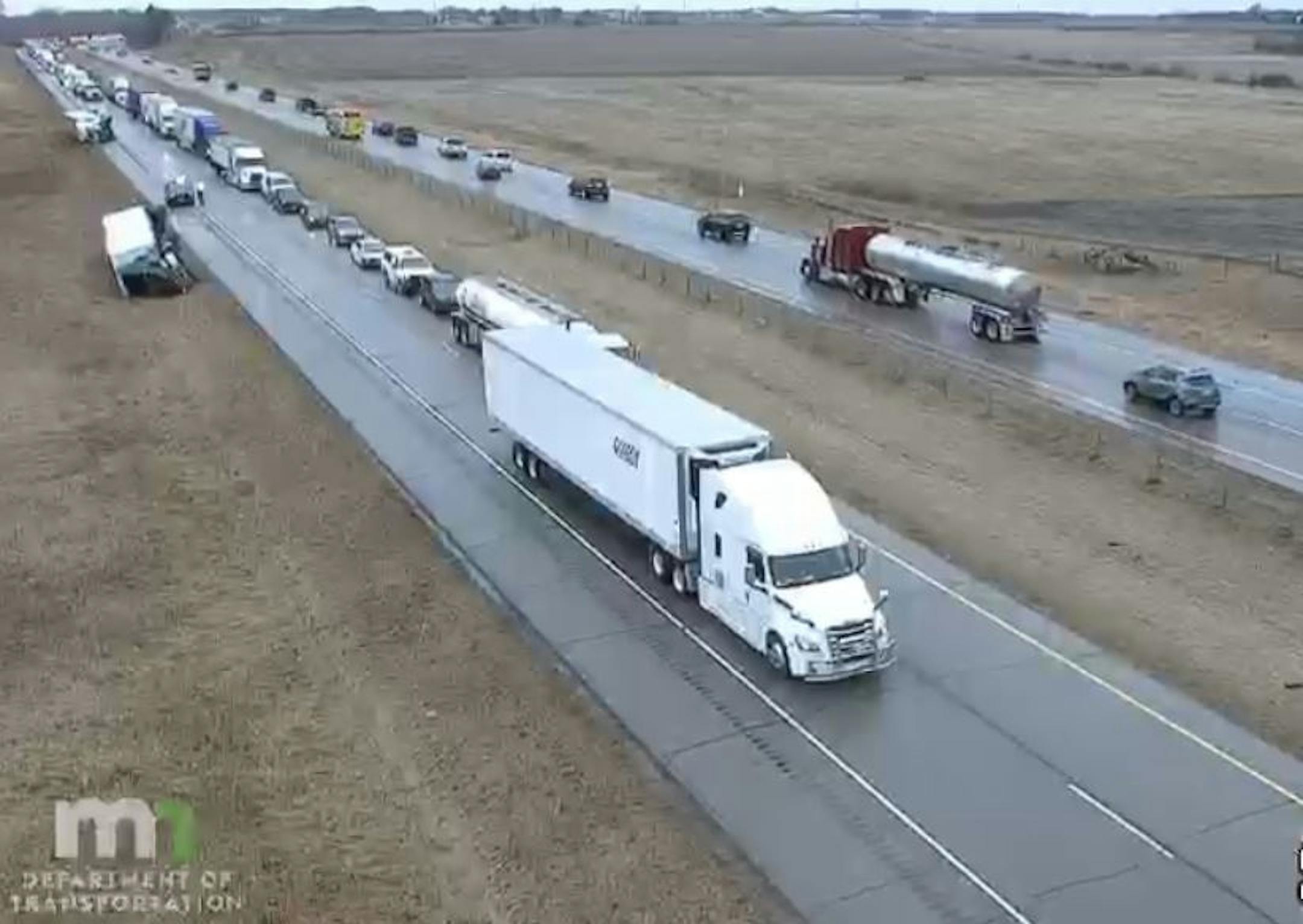 Earlier Tuesday, strong winds from a storm that moved through the Faribault area toppled nine semitrailer trucks on Interstate 35.