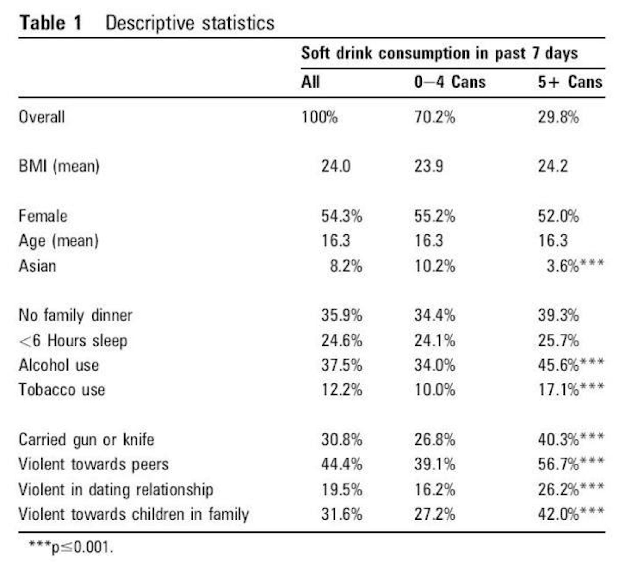 The following table, excerpted from the study, shows the relationship. Anything with *** indicates a strong statistical relationship between the amount of soda consumed and the behavior or demographic that is compared.