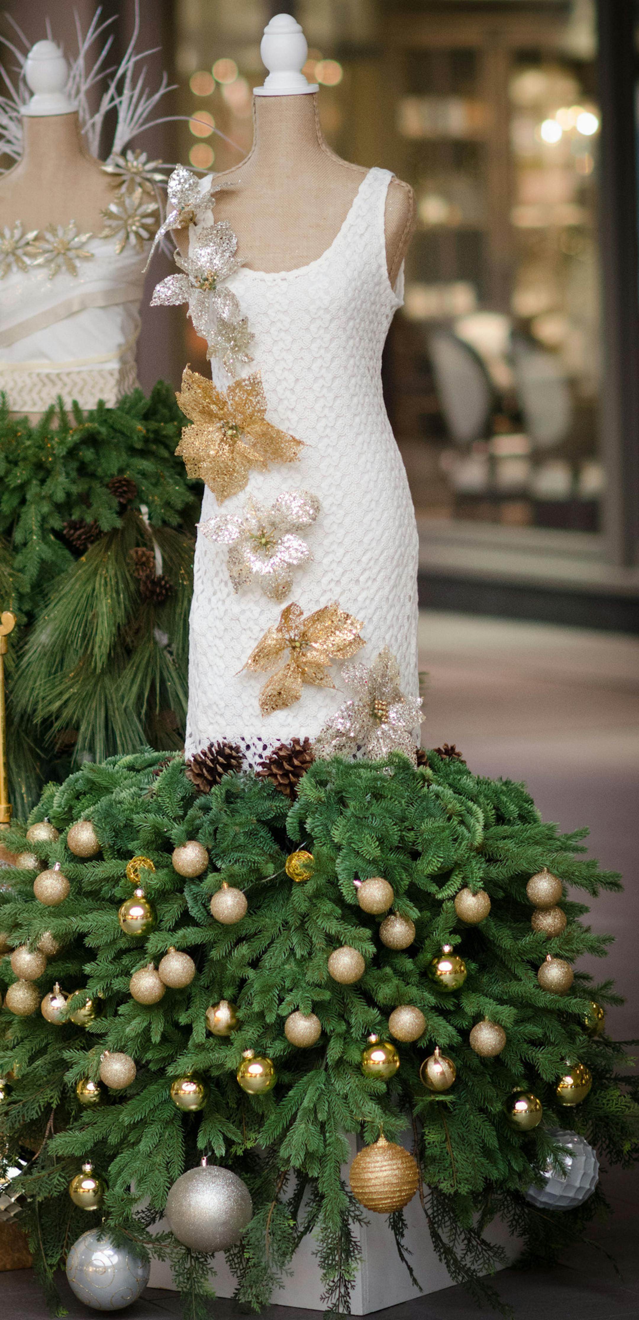 Seven teams of students competed in a contest last weekend using unusual, reclaimed materials (crushed glass, winter greenery, holiday ornaments, pine cones) to create holiday dresses.