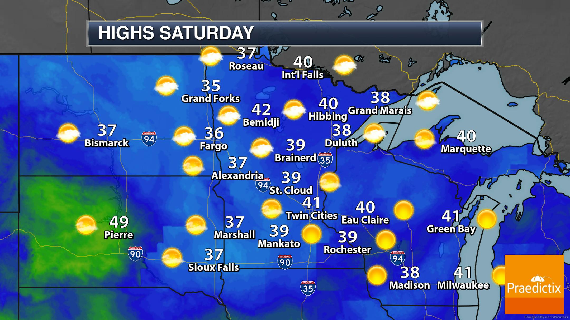 Mostly sunny skies are expected for most of Saturday across the state, but clouds will start to increase into the mid/late afternoon hours in northern Minnesota. Highs will be in the 30s and 40s - up to 20F degrees above average.