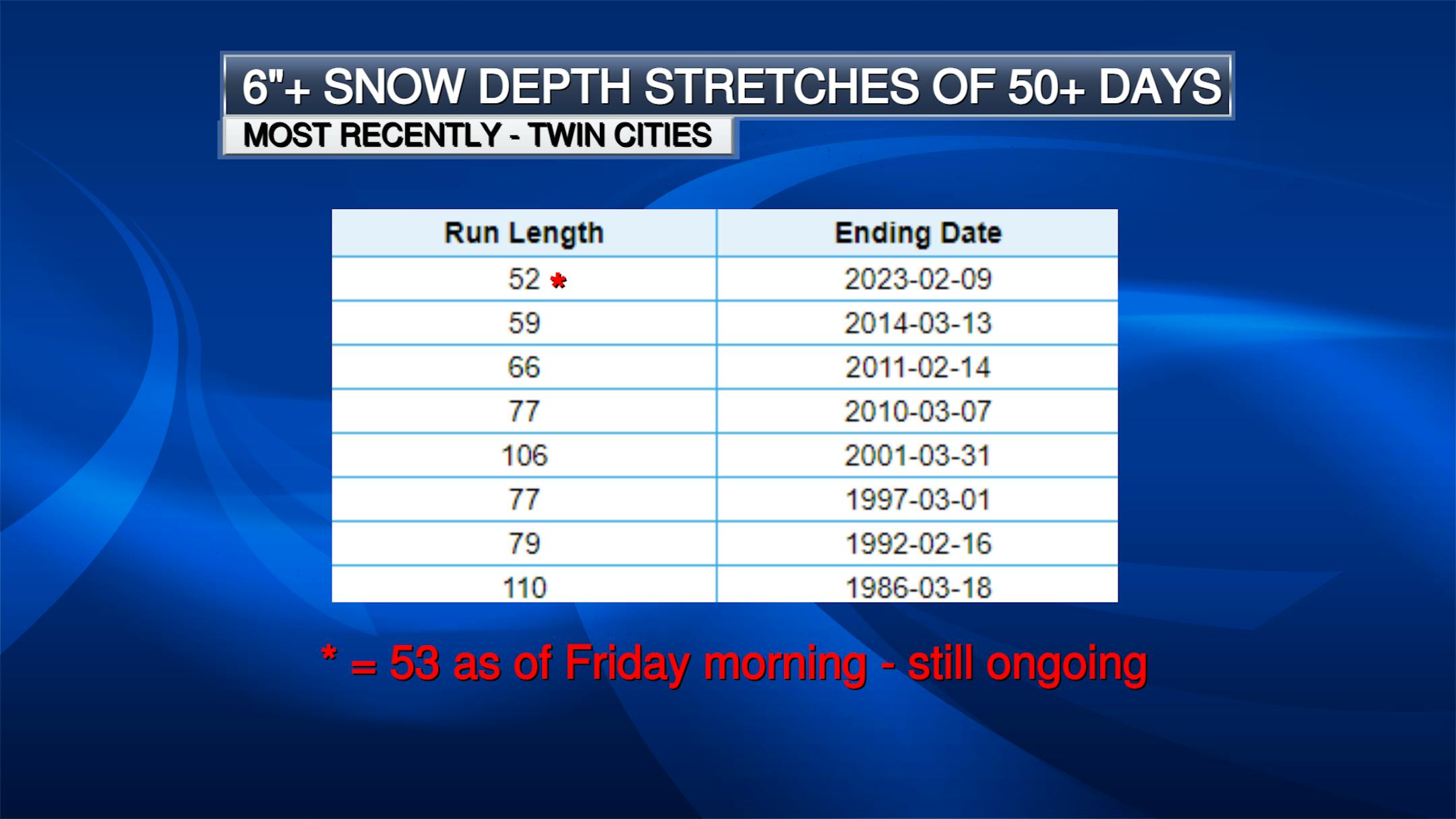 It's been a long stretch with at least half a foot of snow on the ground here in the Twin Cities. As of Friday morning, we're at 53 consecutive days - the 25th longest stretch on record. The most recent stretch of 50+ days was back in the winter of 2013/14. Our current stretch goes back to December 20th.