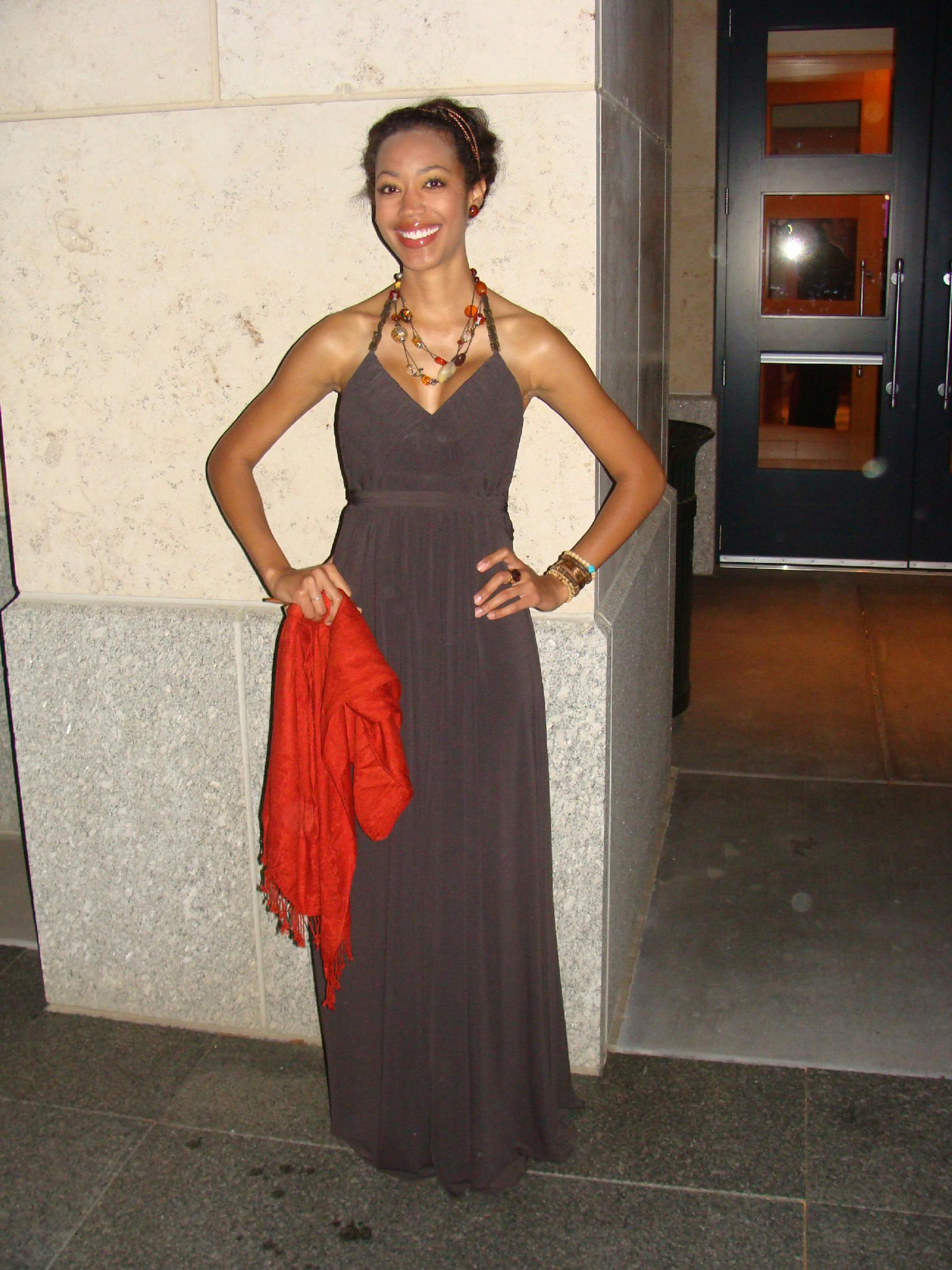 Pretty much everyone at this outdoor fete could have been pictured here -- colorful saris were just as popular as cocktail dresses. But Dottie's simple and glamorous ensemble stood out. Her BCBG dress is from Macy's, her necklace is from a boutique in Iowa, her wrap is from H&M and her earrings and shoes are from Target. One of the bangles was passed on by her grandmother.
