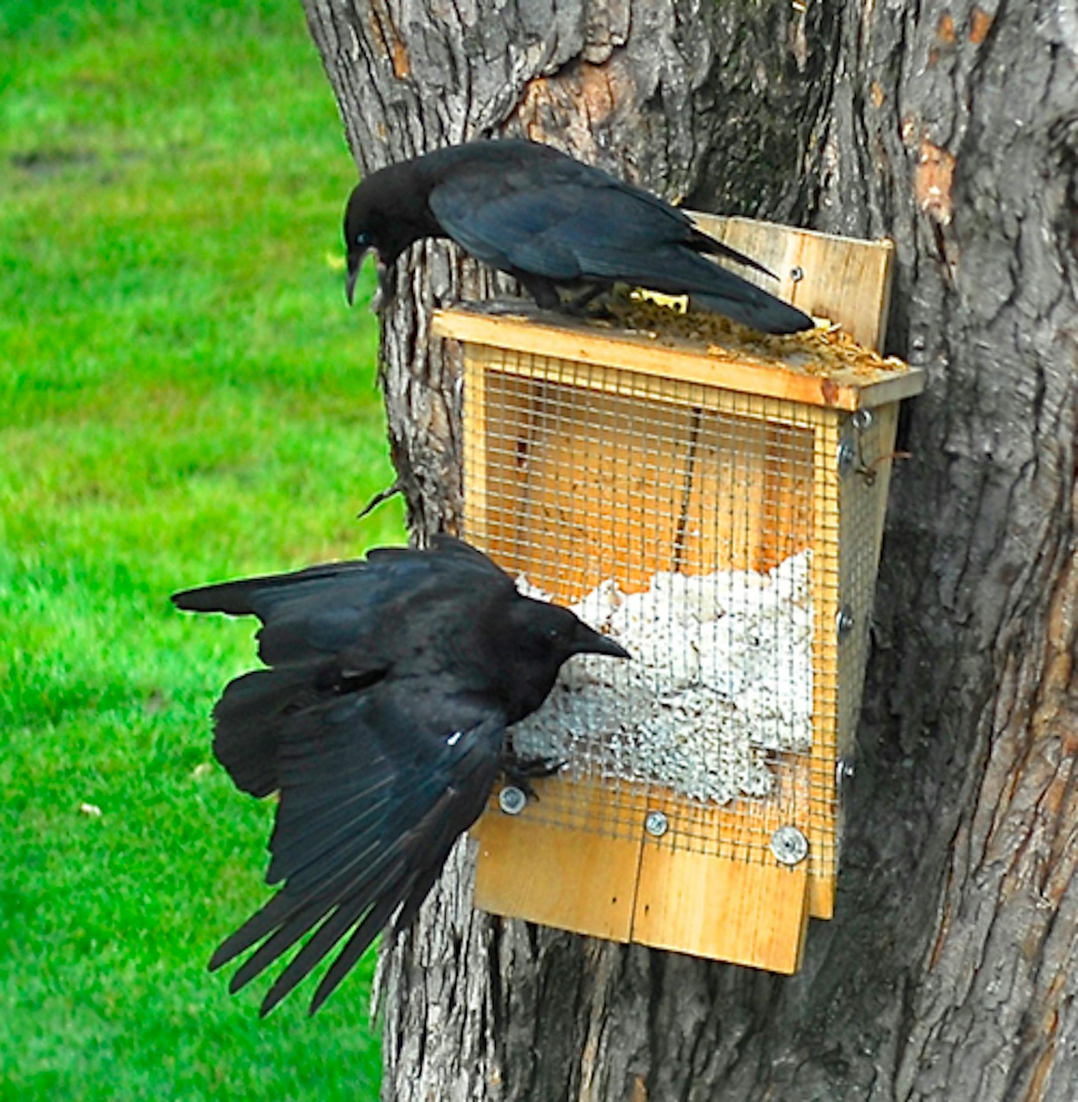 The young crow here, atop the feeder, begs with a loud, annoying nasal whine. We've entertained on occasion an entire crow family of two adults and three juveniles. They all whine.