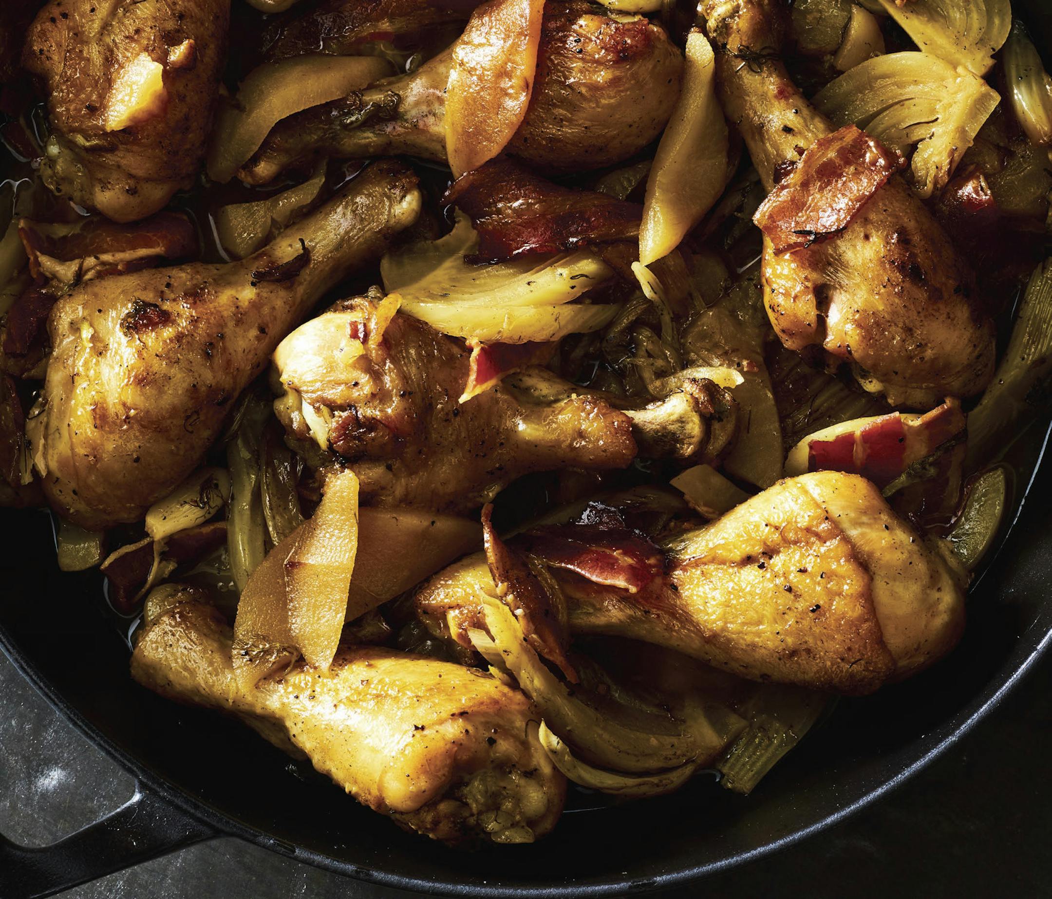 Add the garlic to the pan and cook until lightly browned and fragrant, 3 to 5 minutes. Add the bacon, fennel, apples and salt and give everything a good stir. Continue cooking on high heat for 5 minutes more, until the fennel is looking translucent and is soft to the touch, and the apples start to caramelize. Add the cider, scrape the bottom of the pan to deglaze, bring the mixture to a boil, turn off the heat and transfer the pan to the oven, uncovered.