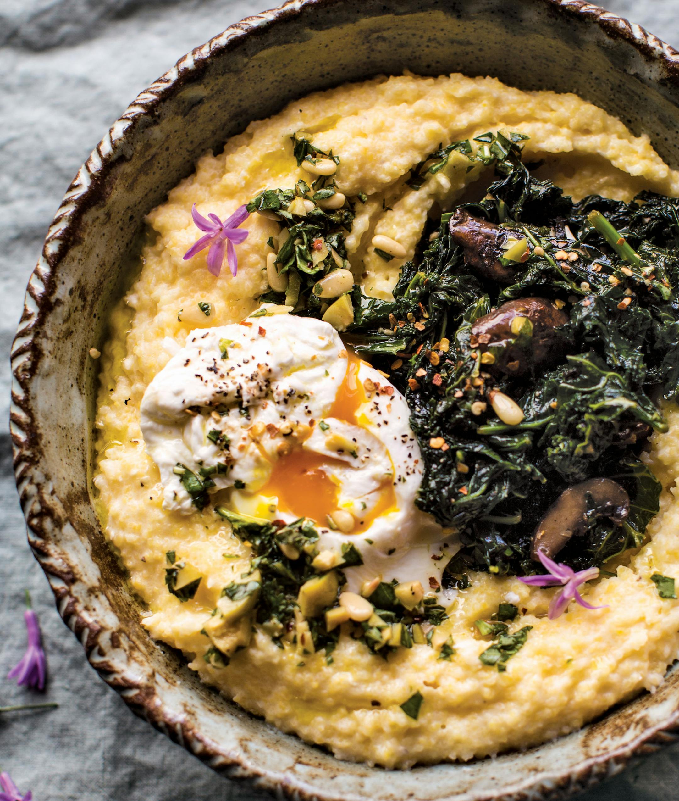 To serve, divide polenta among bowls or plates and top each serving with mushroom-kale mixture and a poached egg. Season egg with salt and black pepper. Spoon a little of the Green Olive Pesto on top and serve.