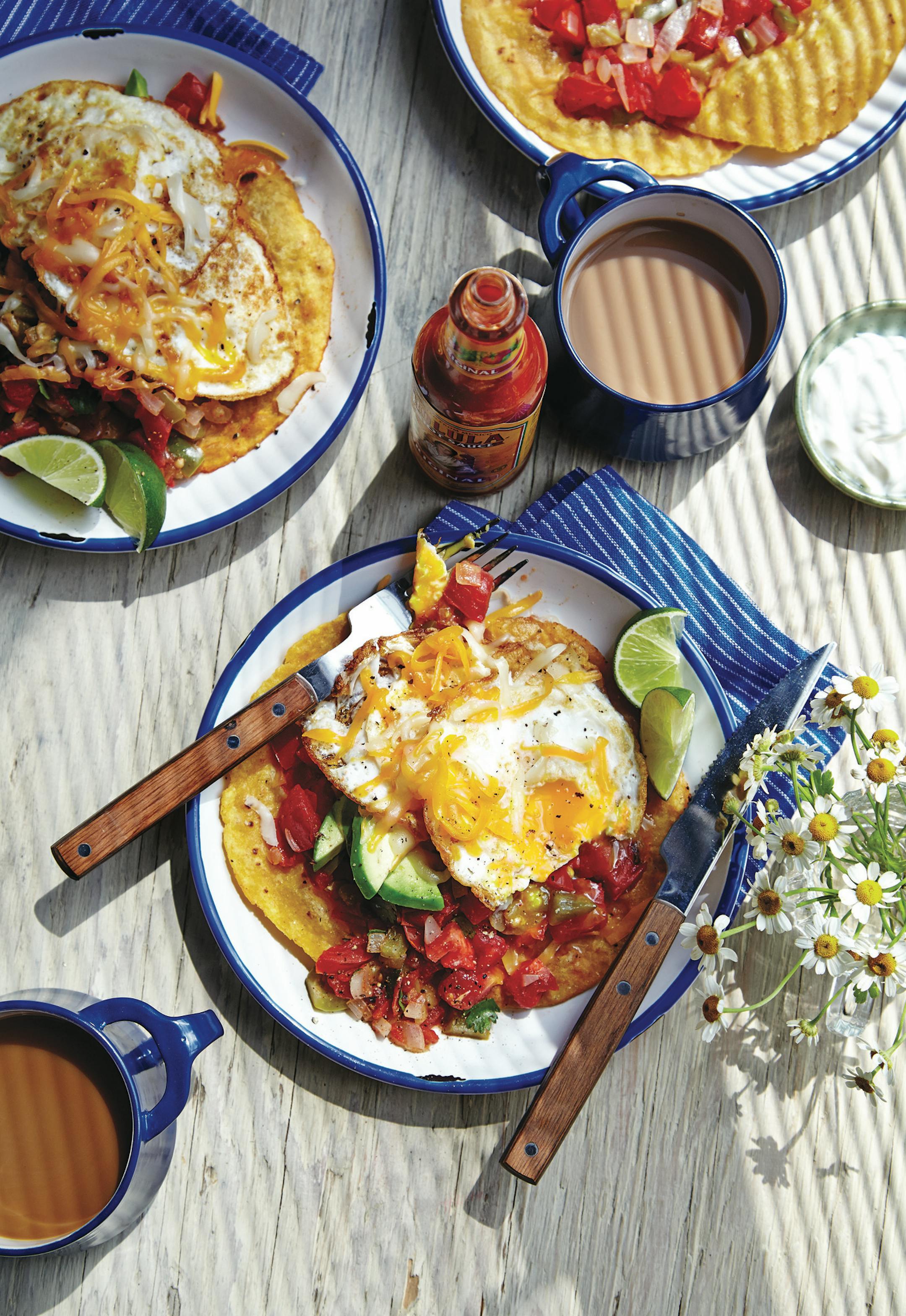 Place 2 tortillas on each of 4 plates. Top each tortilla with about 1/2 cup salsa, avocado slices, 1 fried egg, crema and cheese. Serve with lime wedges.