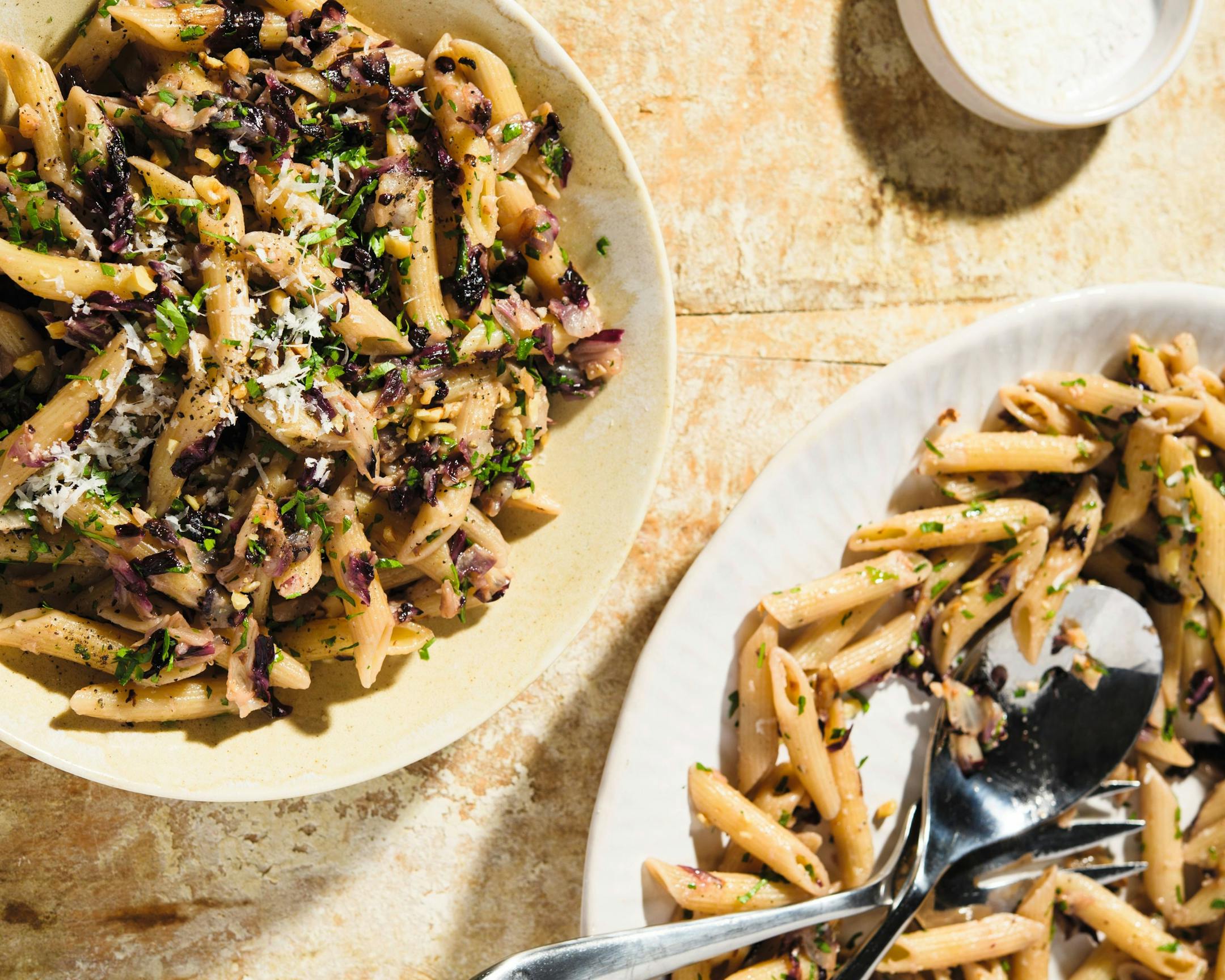 From “Milk Street Backroads,” by Christopher Kimball and J.M. Hirsch, who write: “In Venice, where radicchio is much loved, home cook Francesco Bernardi taught us his recipe for this simple yet delicious and elegant dish, Pasta con Radicchio, Noci e Pepe Nero. Chopped radicchio is browned in garlic-infused olive oil, its flavor becoming rich and complex and its texture softening slightly. The layers of pleasantly bitter notes — from the radicchio and the toasted walnuts — are perfectly balanced by the nuttiness and umami of Parmesan, the bright tang of lemon juice and the pungency of black pepper.” (Voracious, 2025).