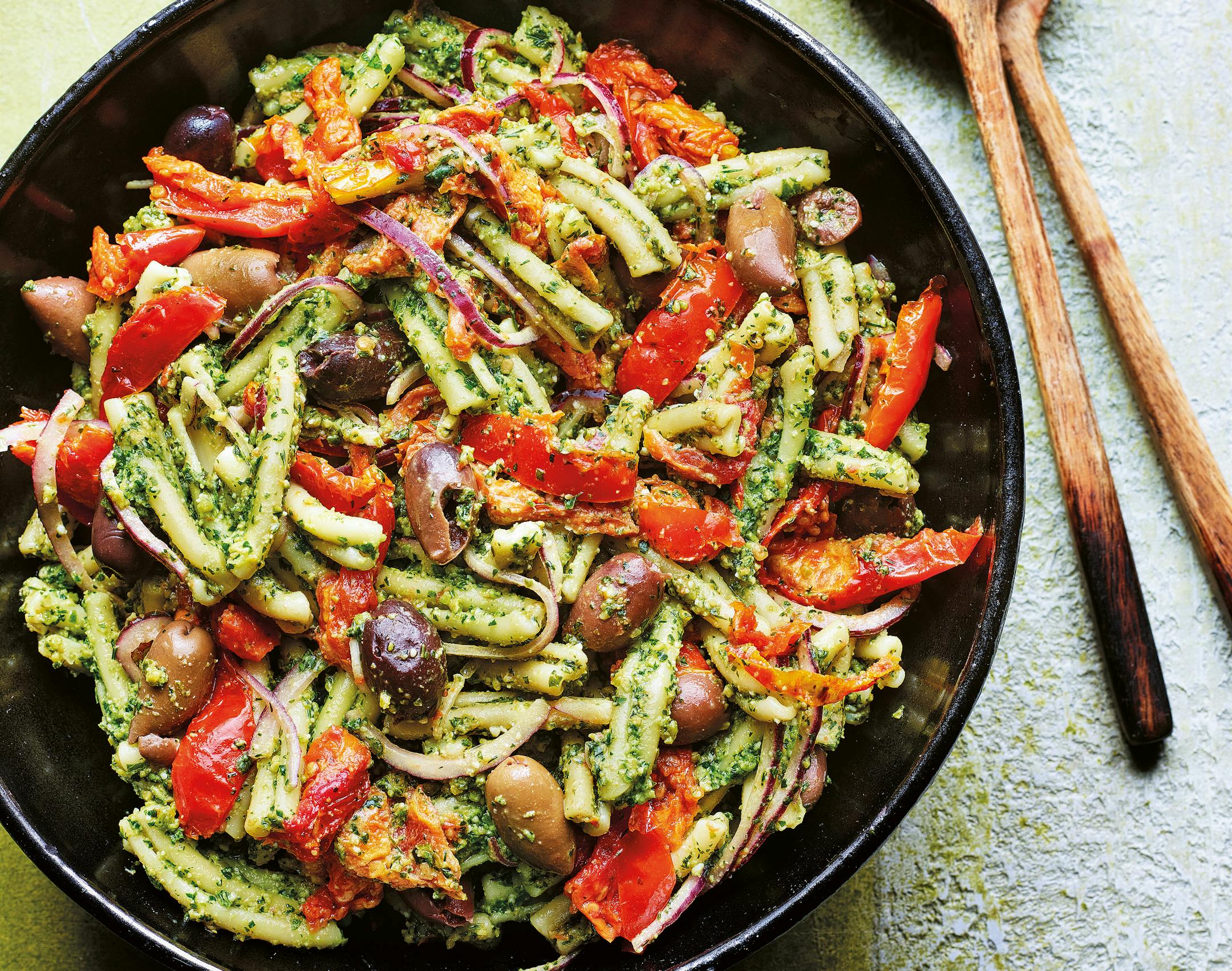From “Flavor,” by Sabrina Ghayour, who writes: “I have been making this salad for many years now, using both the pistachio pesto with the recipe or — when I’m short of time and ingredients — store-bought fresh basil pesto. We all make compromises sometimes, but I must admit I prefer the punchy combination of herbs in this pistachio pesto mix, brightened up even more with semi-roasted (aka sun-dried) tomatoes and my favorite Kalamata olives and red onion. It’s a lunchbox classic for me, and something I make in big quantities for the household to snack on over a few days. I also love serving it with roast chicken and as a picnic dish, too.” (Aster, 2024).