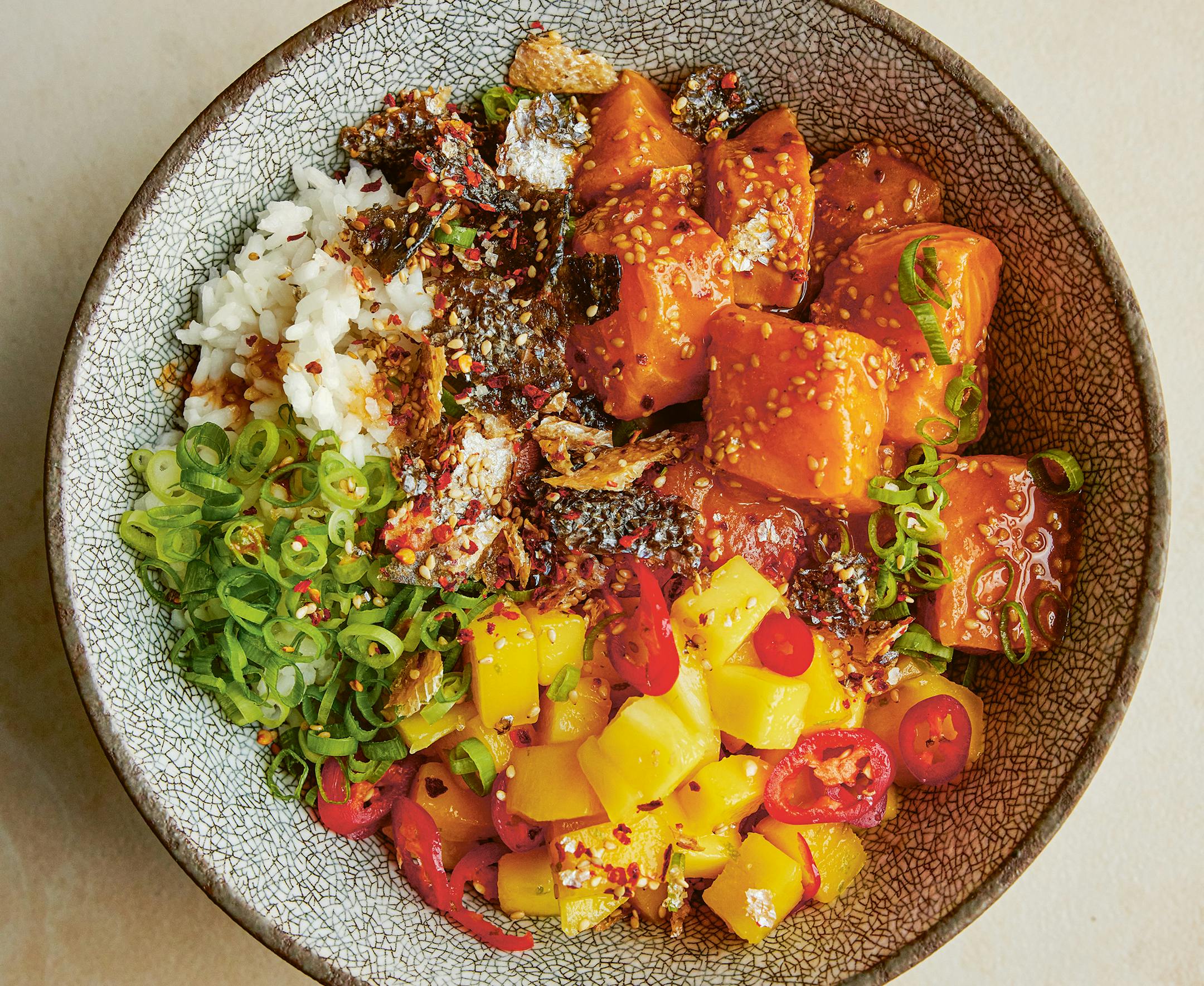 On steamy summer nights — or after a weekend of indulgent eating — a refreshing supper is in order, and this fits the bill. Note: Be sure to use sushi-grade salmon in this recipe, as it’s served raw here. People can be afraid of fish skin, but like chicken skin, you can crisp it up in the oven and turn it into a crunchy sea-flavoured garnish, taking inspiration from the Japanese condiment furikake, which is normally made with toasted seaweed. At the same time, you can feel good about yourself for maximizing every bit of the fish. From “Saladology: Fresh Ideas for Delicious Salads,” by Theo Kirwin (Mitchell Beazley, 2024).