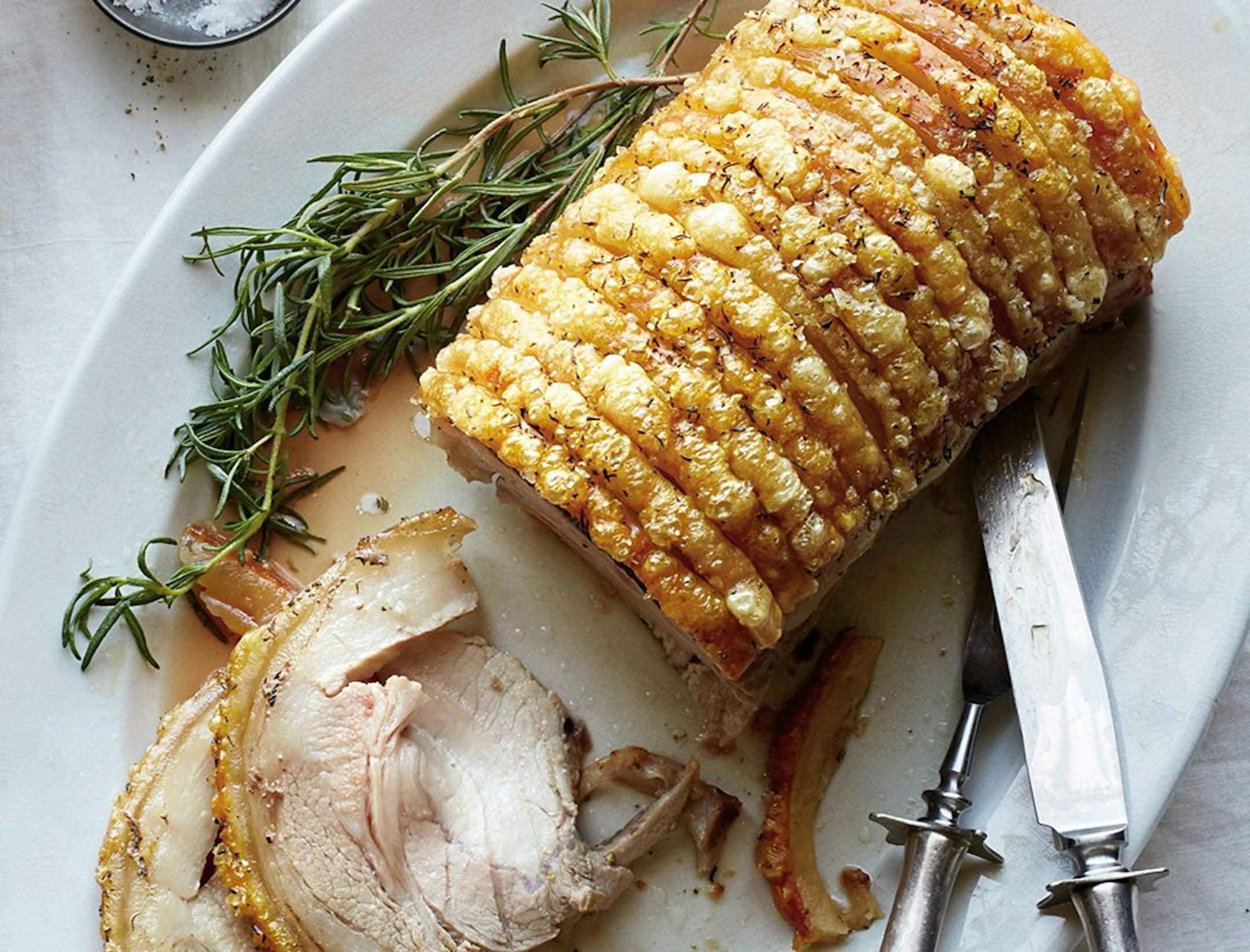 Note: Most pork roasts are sold without skin, but you can order pork loin with skin from most butchers. The advantage of skin is that it gets nice and crunchy. You can also roast the meat without the skin, but at least have a small layer of fat on it to keep it juicy. The sauerkraut here is a quick pan version. Serve the meat with potatoes, roasted or mashed. Leftovers are great in sandwiches. From "Scratch," by Maria Rodale.