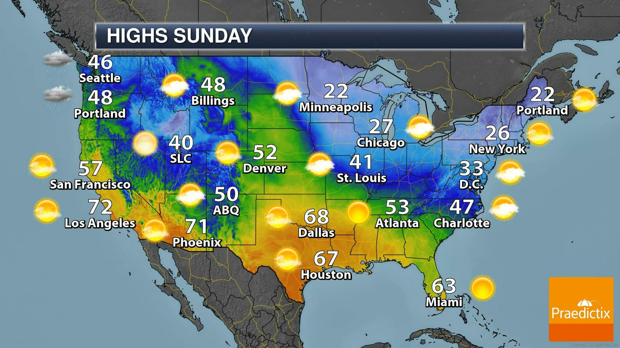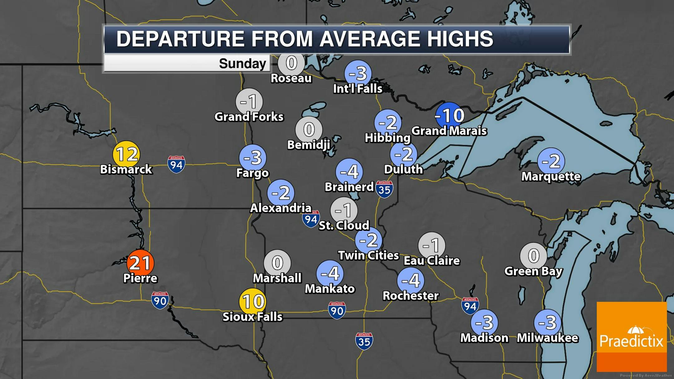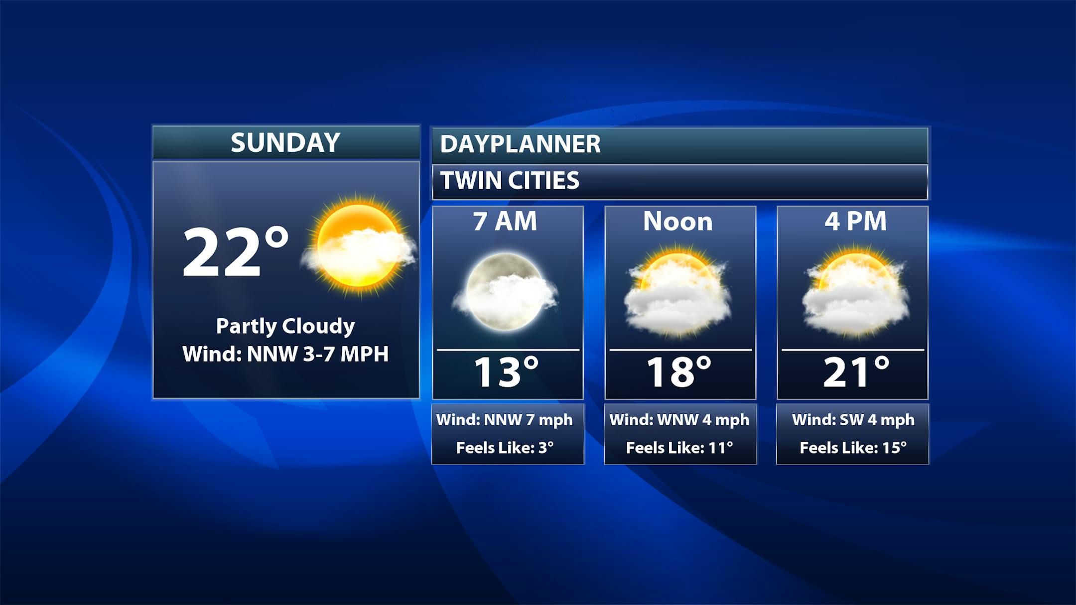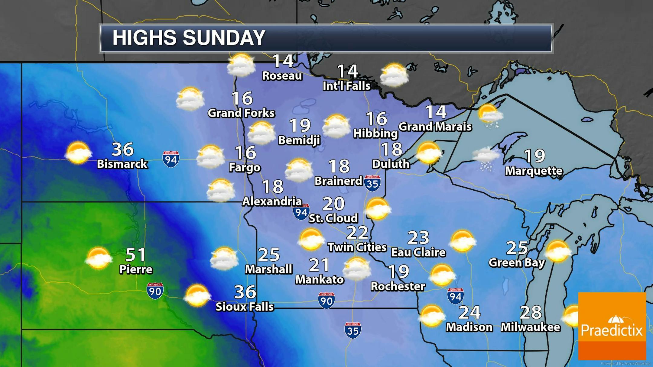 The weather outlook for Minneapolis on Sunday shows near average temperatures in place on Sunday with highs warming into the low/mid 20s, which will be close to or slightly below average