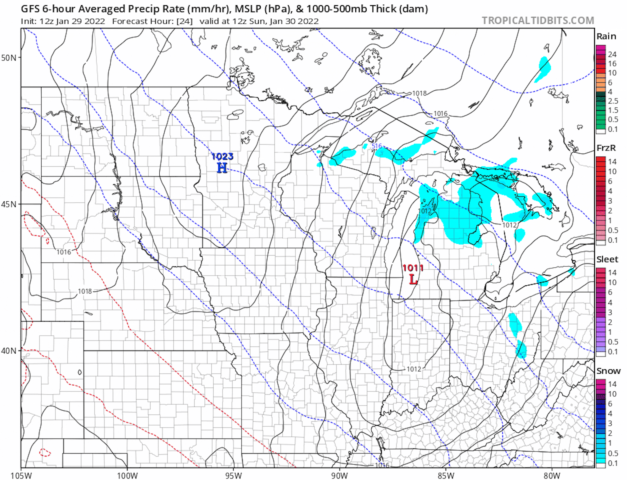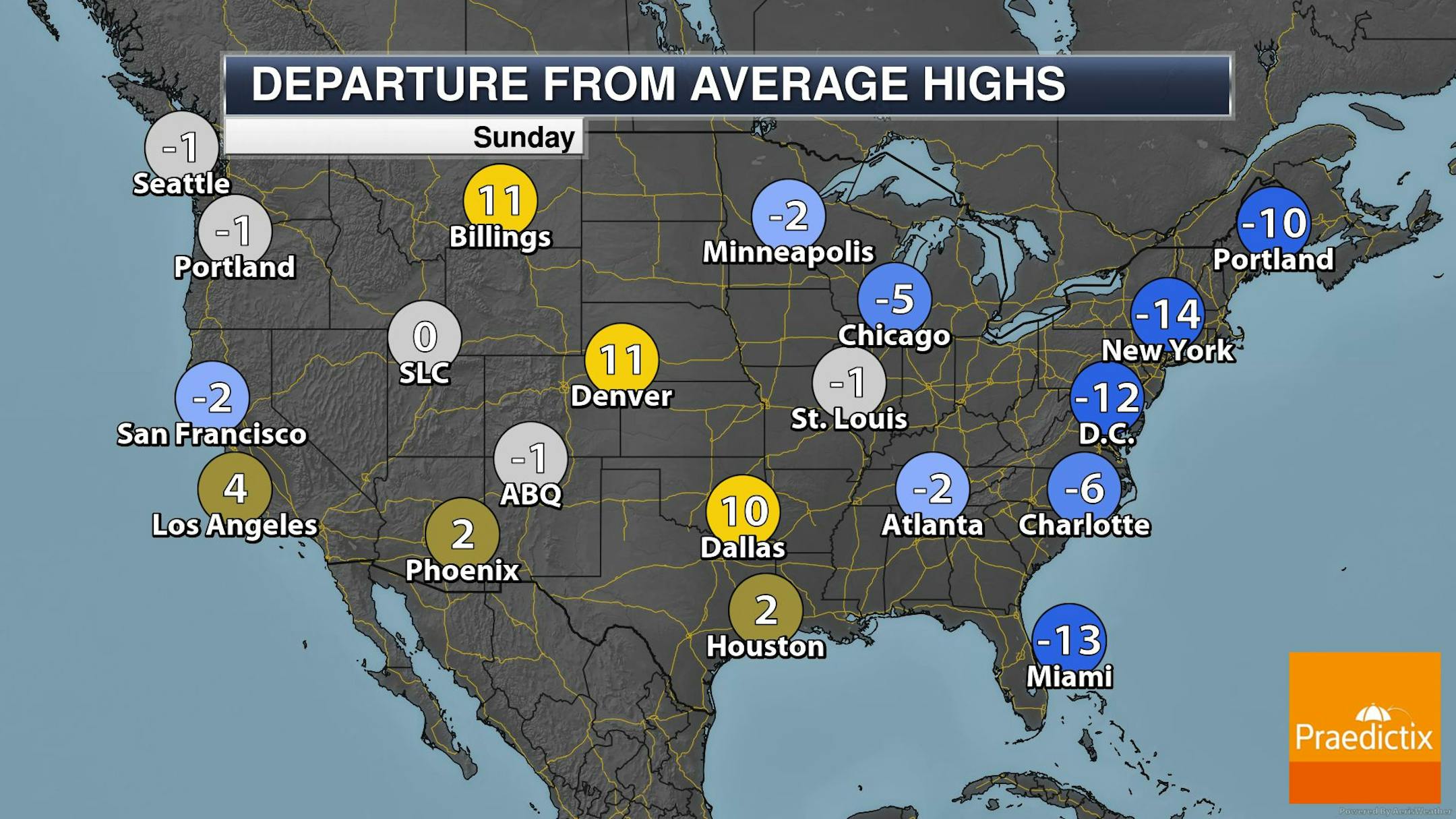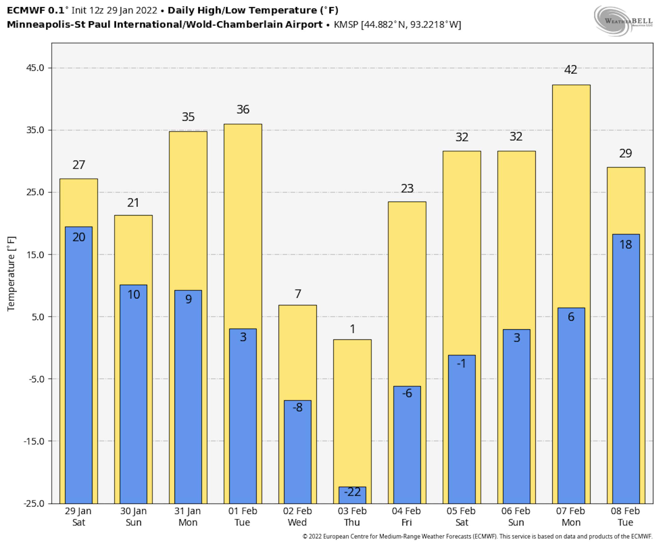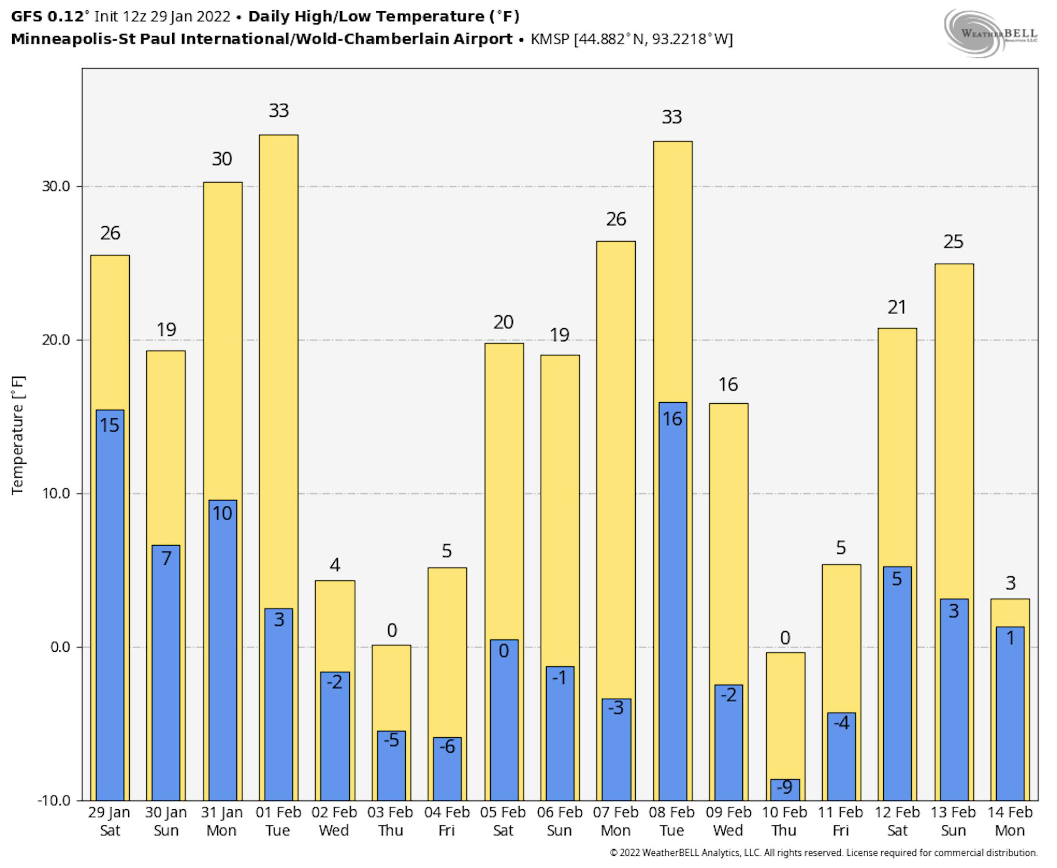 The weather outlook for Minneapolis on Sunday shows near average temperatures in place on Sunday with highs warming into the low/mid 20s, which will be close to or slightly below average