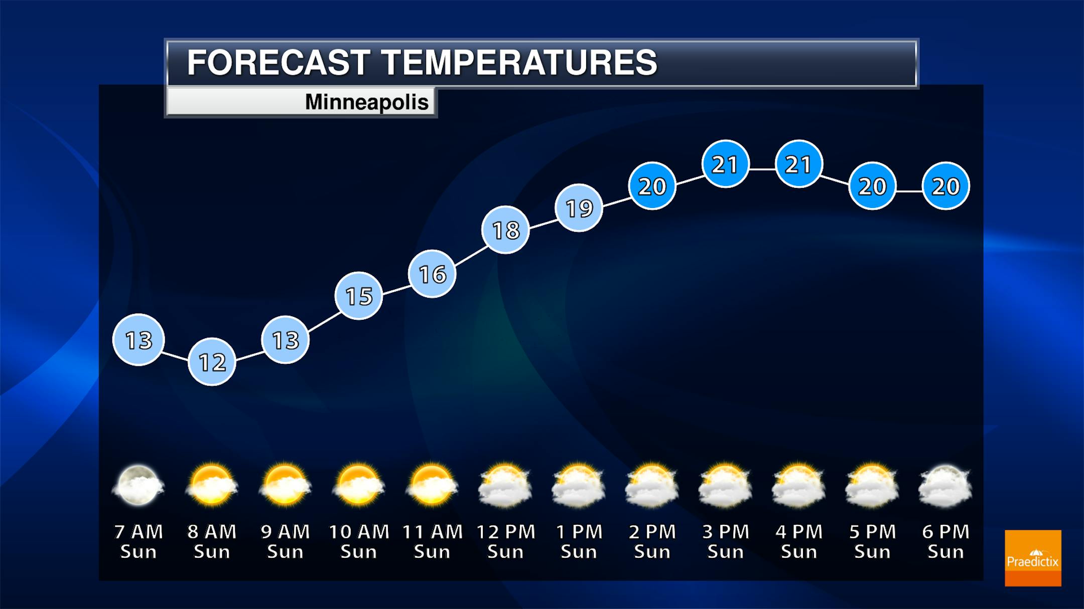 The hourly temps for Minneapolis on Sunday show temps starting in teens above zero, which will feel very warm compared to where we've been. High temps will warm into the lower 20s under partly to mostly cloudy skies.