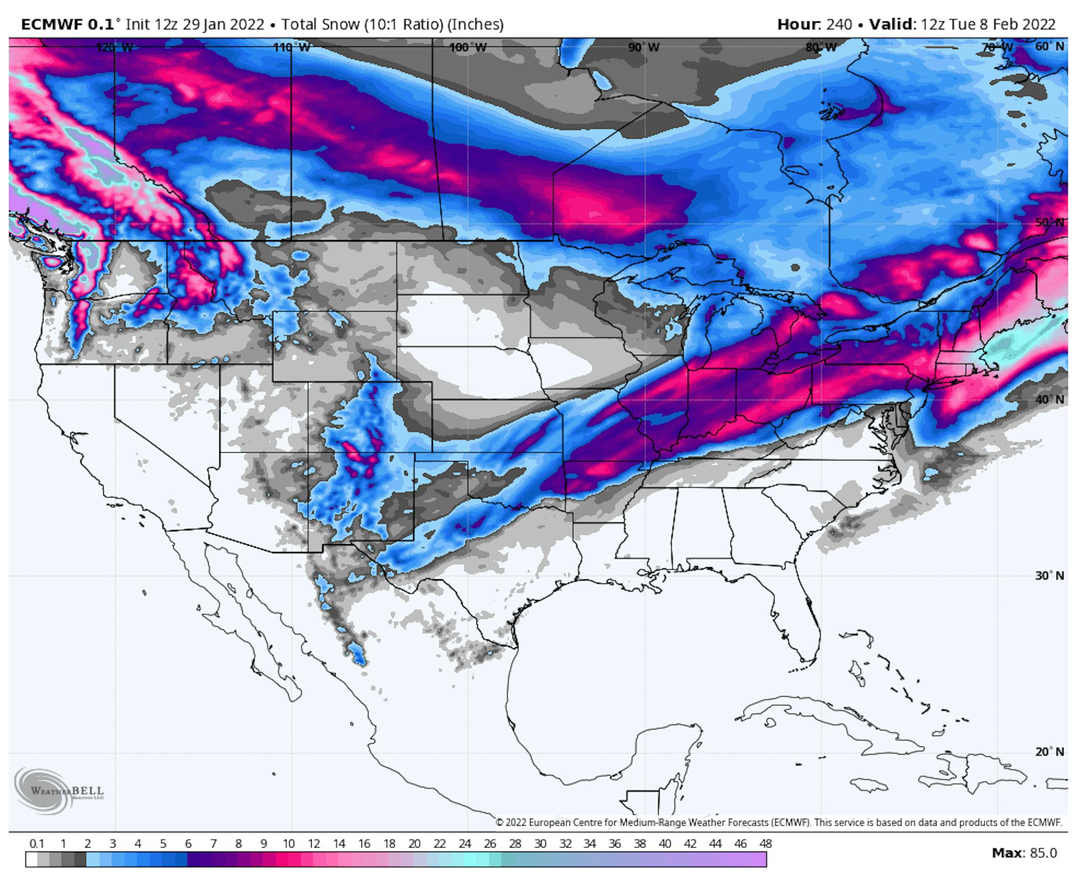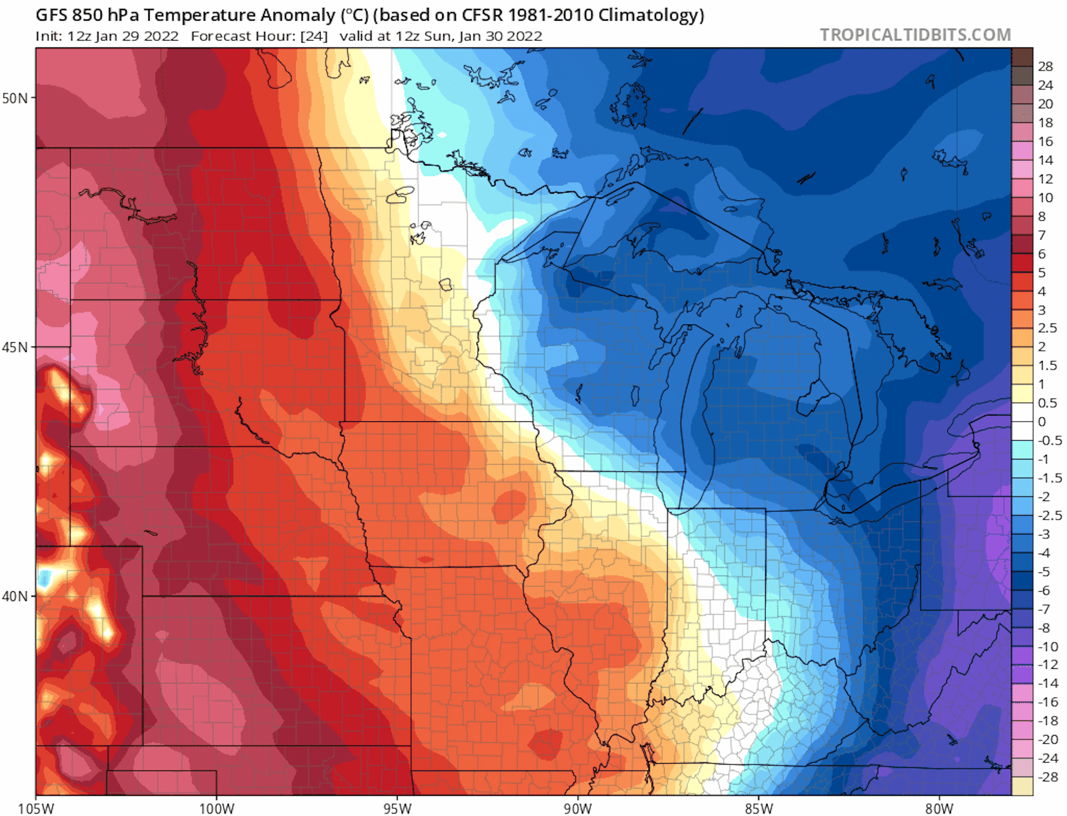 Here's the 850mb temp anomaly through next week. Note that temps will be mild through the first half of the week before a major blast of cold air arrives later in the week
