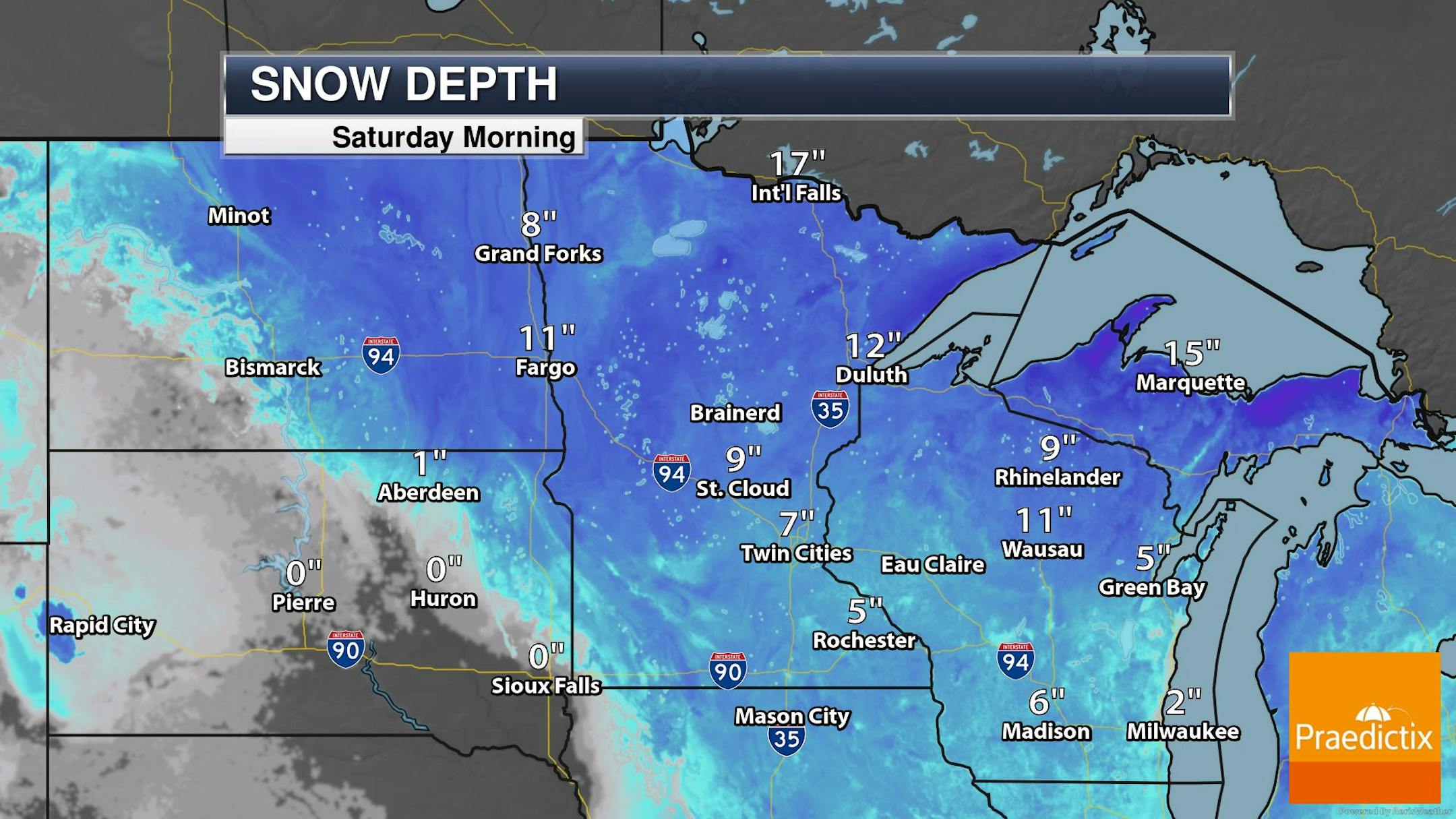 The latest snow depth reports show a fairly decent base across the region. The Metro was reporting around 7" as of Saturday morning, but has you head north, there are some double digit reports. According to the MN DNR Snowmobile and cross-country ski trails are generally reported to be in good to very good conditions across the northern half of the state. Trails in the southern half of the state are reported to poor condition with little to now snow on the ground there.