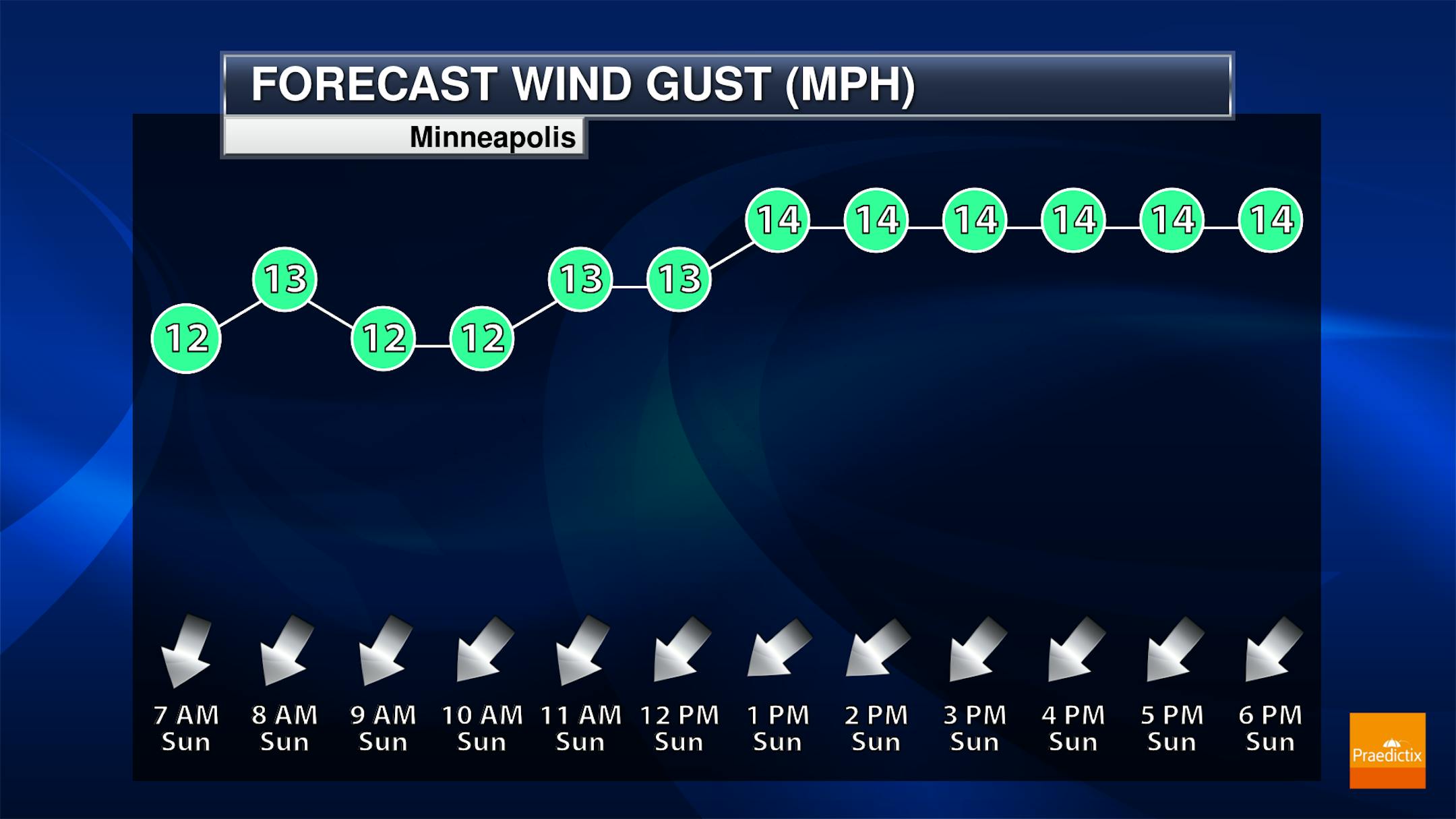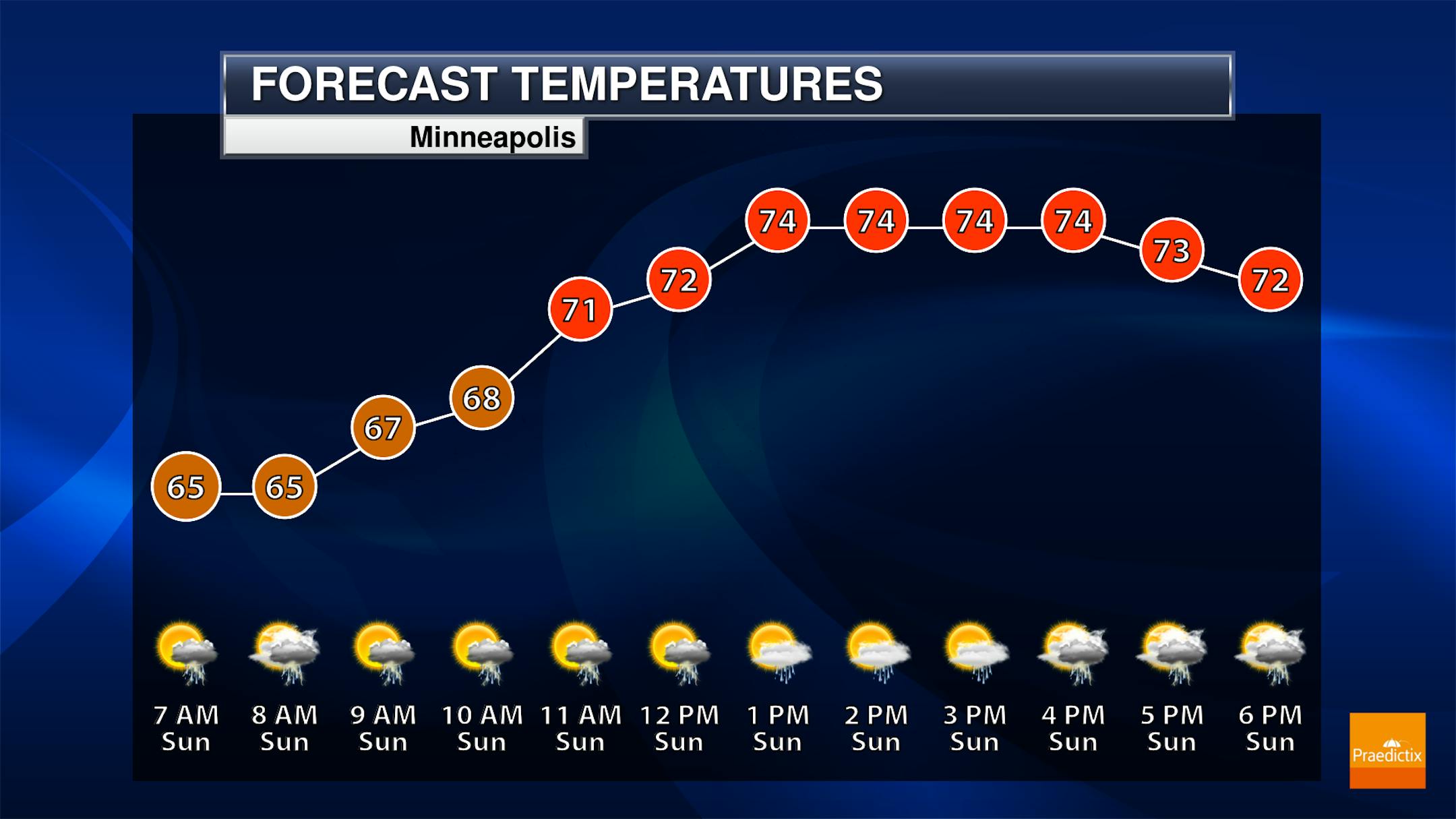 The hourly forecast for Minneapolis on Saturday shows temperatures starting in the mid 60s and warming into the mid 70s by the afternoon. North to northeasterly winds will be a bit breezy with gusts near 15mph to 20mph through the day.