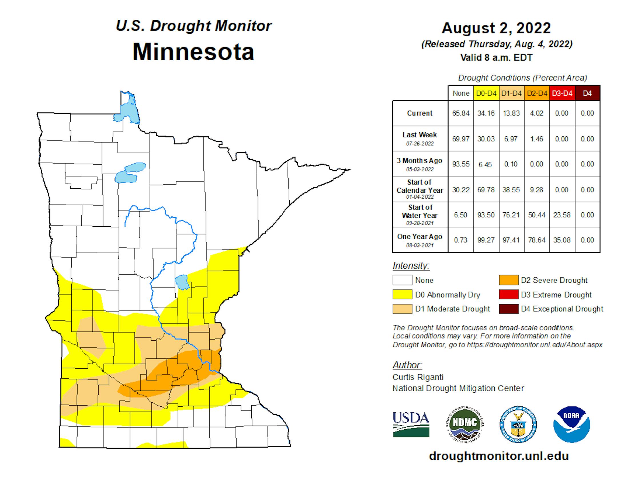 Here's the latest drought update across Minnesota. Severe drought has expanded from nearly 1.5% last week to 4% this week, while moderate drought has expanded from nearly 7% to 14%.