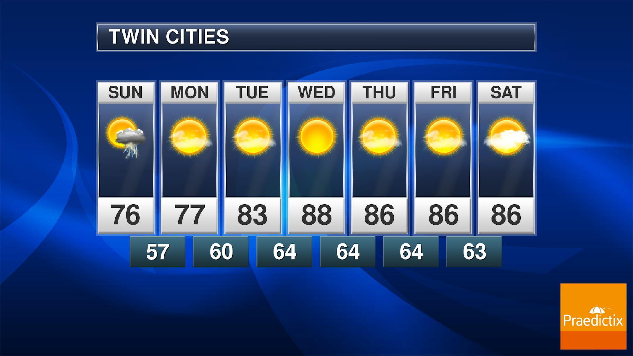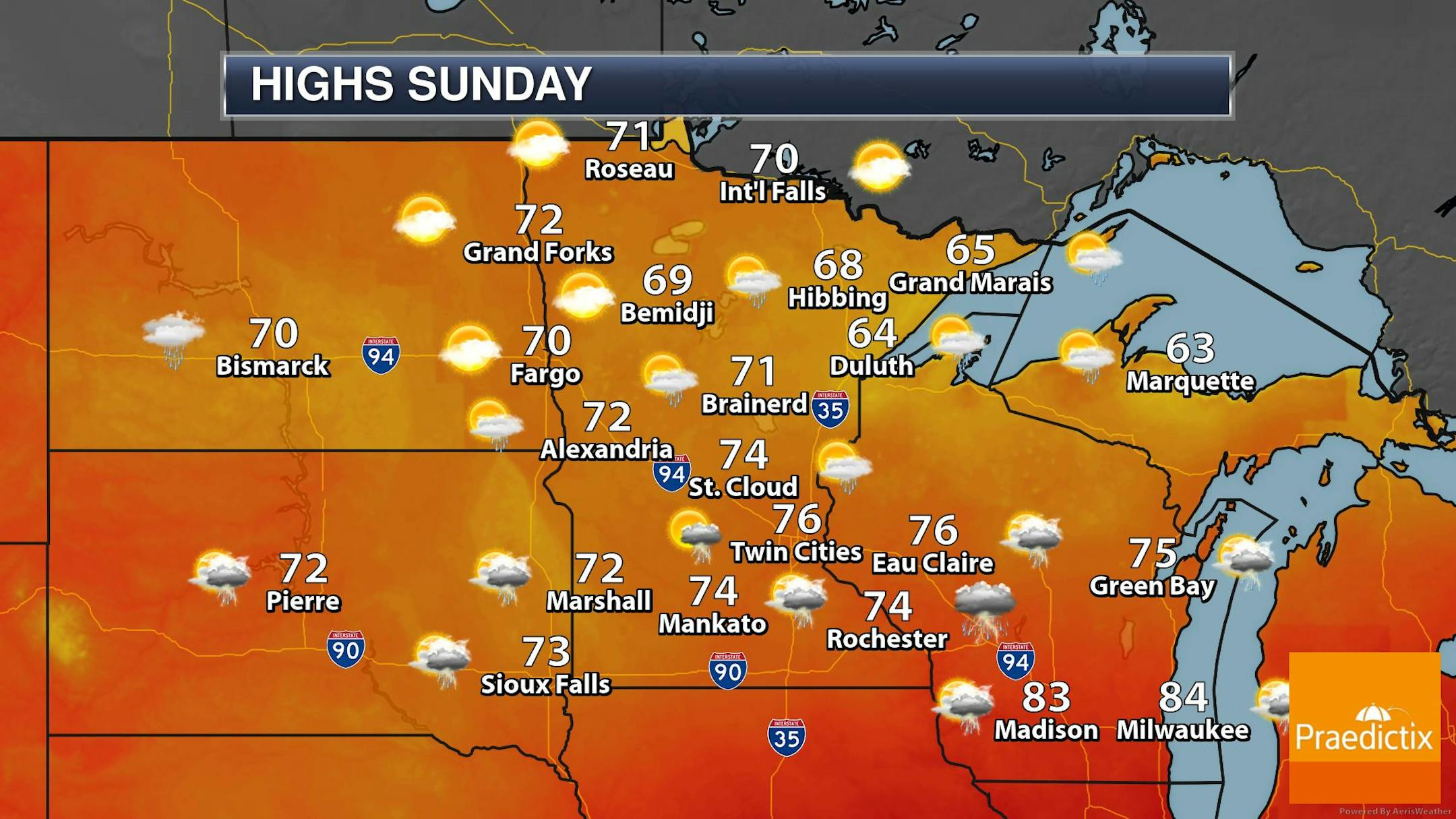 The weather outlook for Minneapolis on Sunday will still be somewhat unsettled with scattered showers and storms with pockets of locally have rains, especially in southern Minnesota.